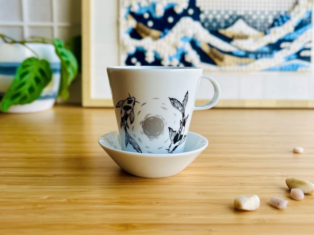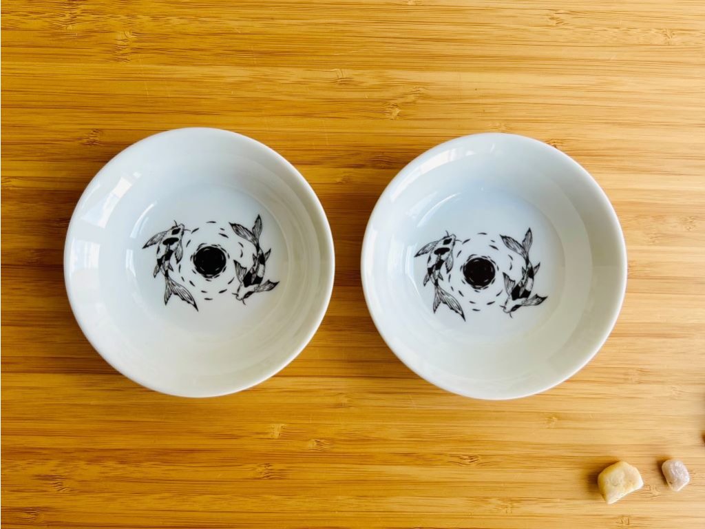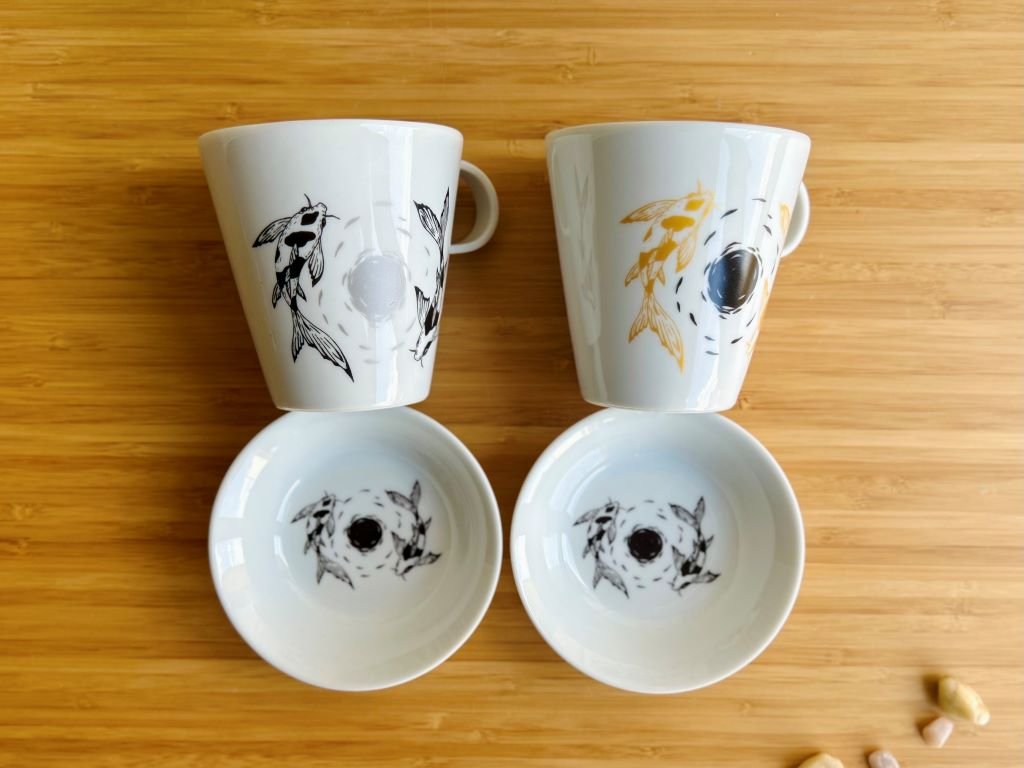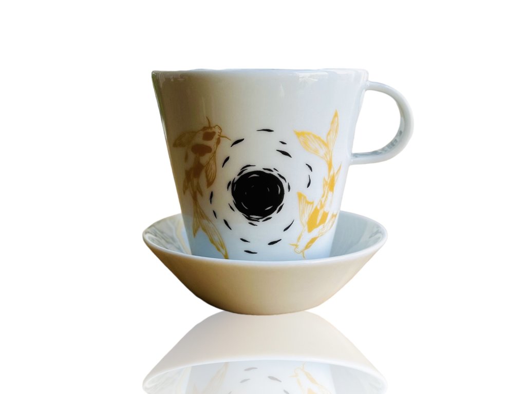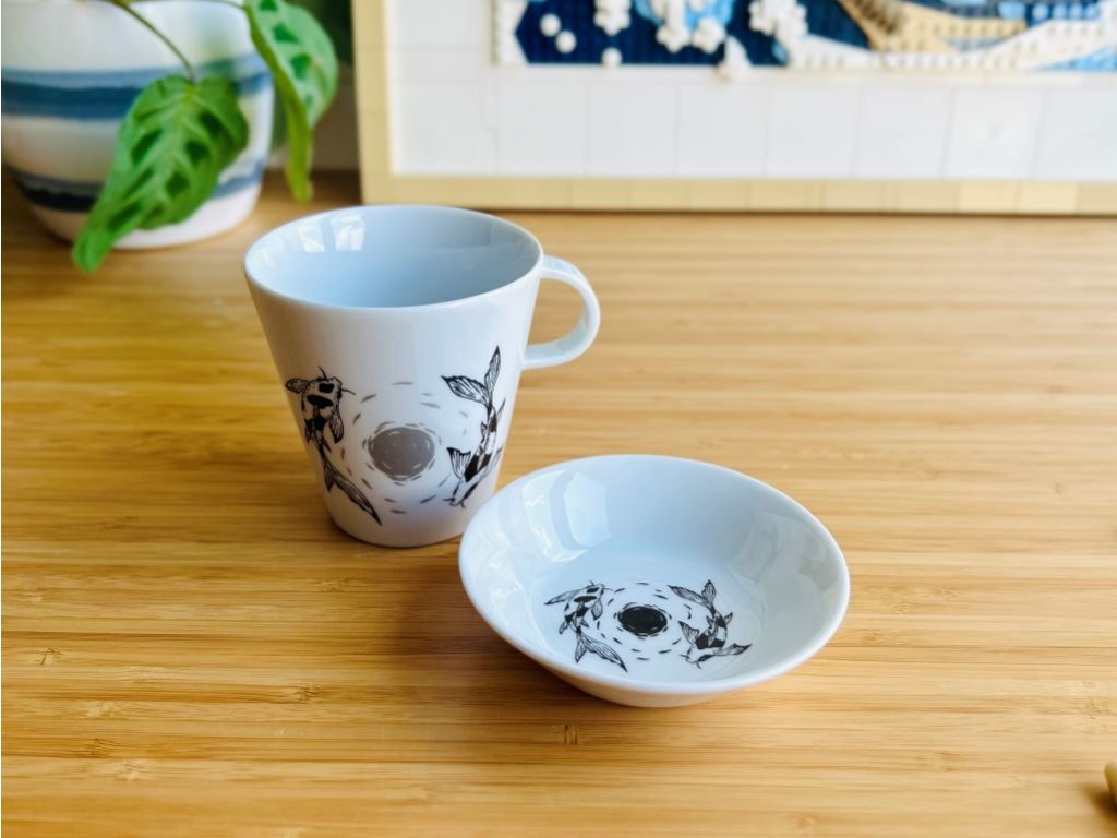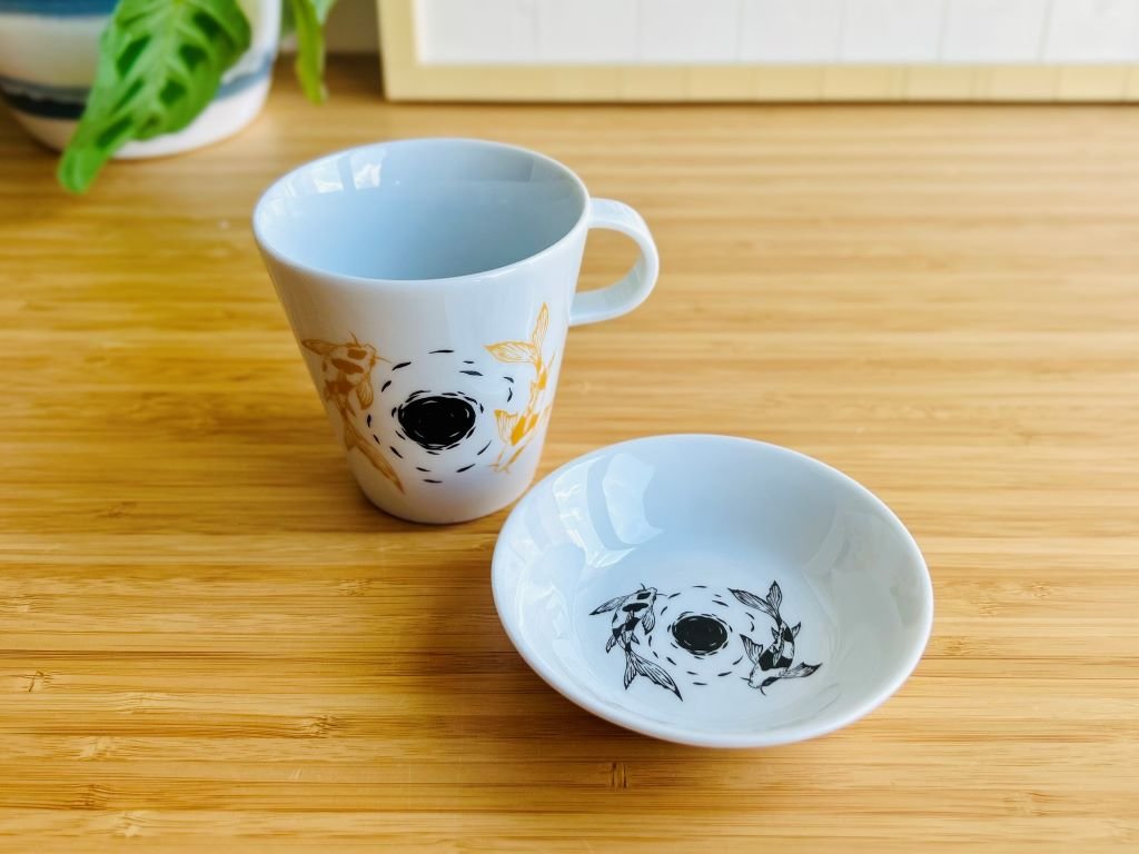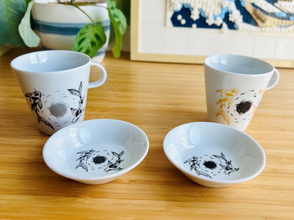 - Porcelán je ozdoben reprodukcí mých perokreseb koi kapříků hned ve dvou barevných varintách: černých koi kapříků a stříbrného odrazu měsíce na vodní hladině NEBO zlatých koi kapříků a černého odrazu měsíce