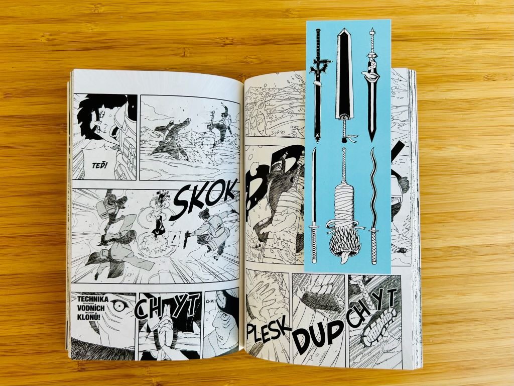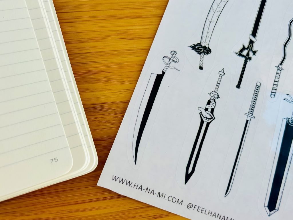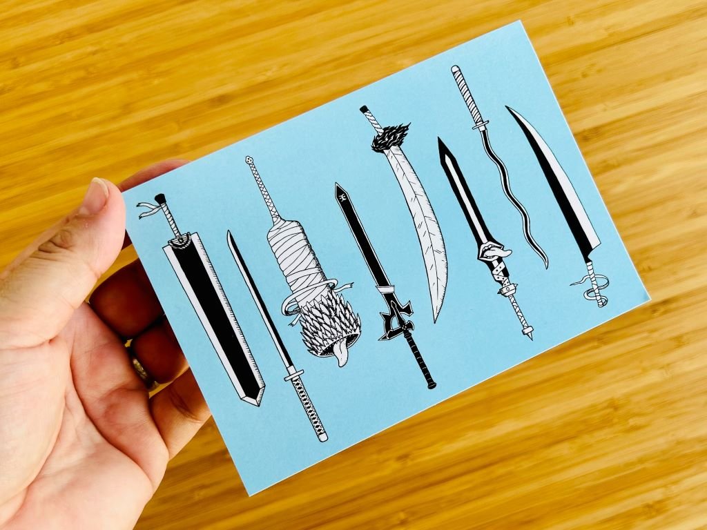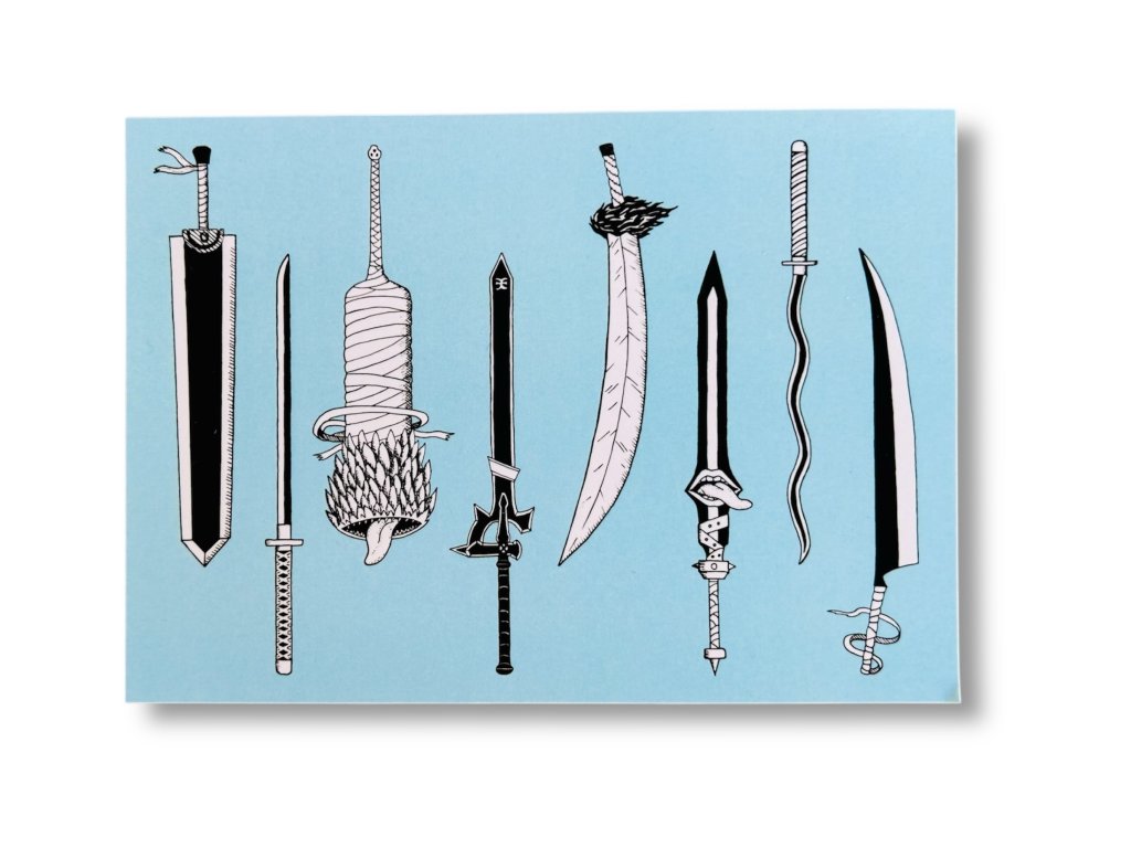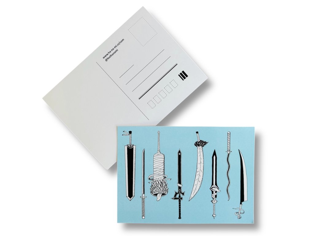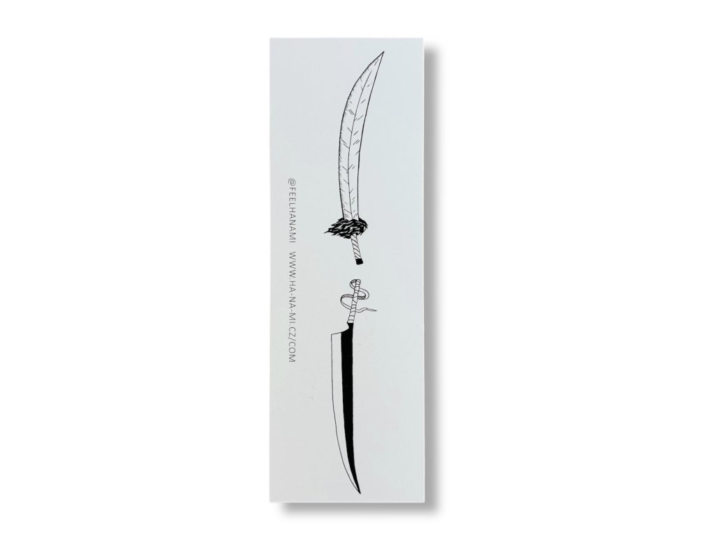 - Arch samolepek, pohlednice a záložka ozdobená reprodukcí mých perokreseb perokreseb mečů ze známých anime seriálů