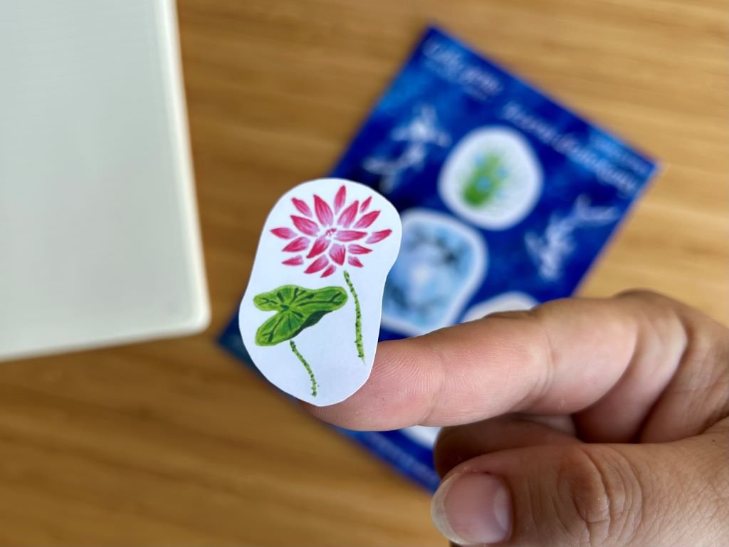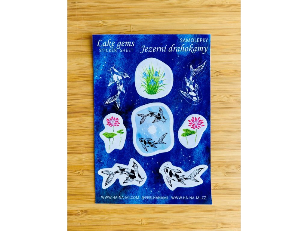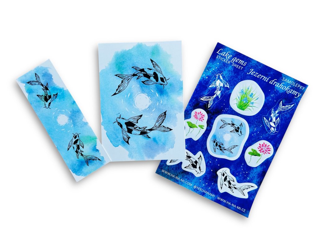 Balíček obsahuje arch samolepek, pohlednici a záložku do knížky s koi kapříky