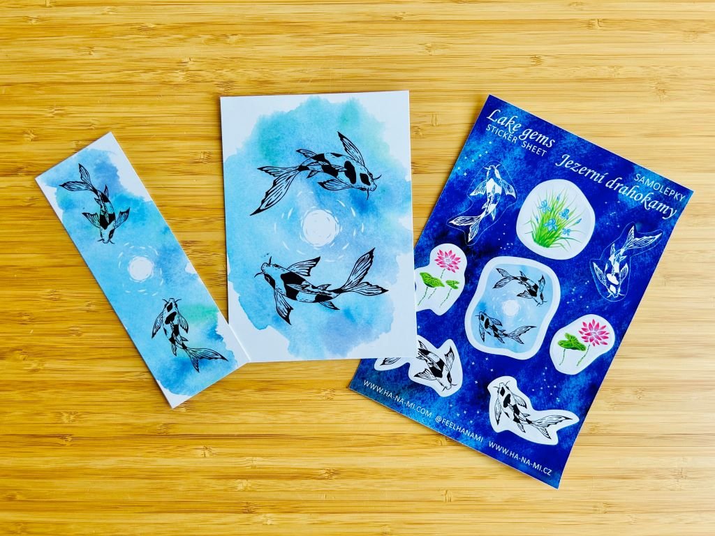 - Arch samolepek, pohlednice a záložka ozdobených reprodukcí mých akrylových maleb a perokreseb koi kapříků a odrazu měsíce na vodní hladině