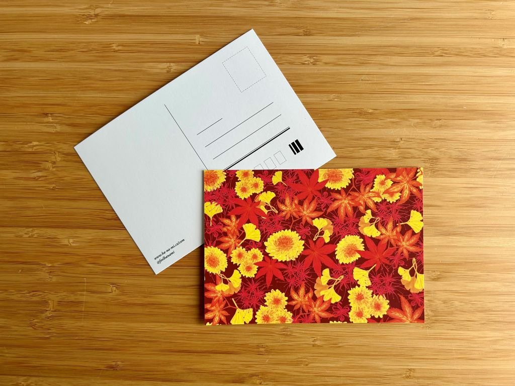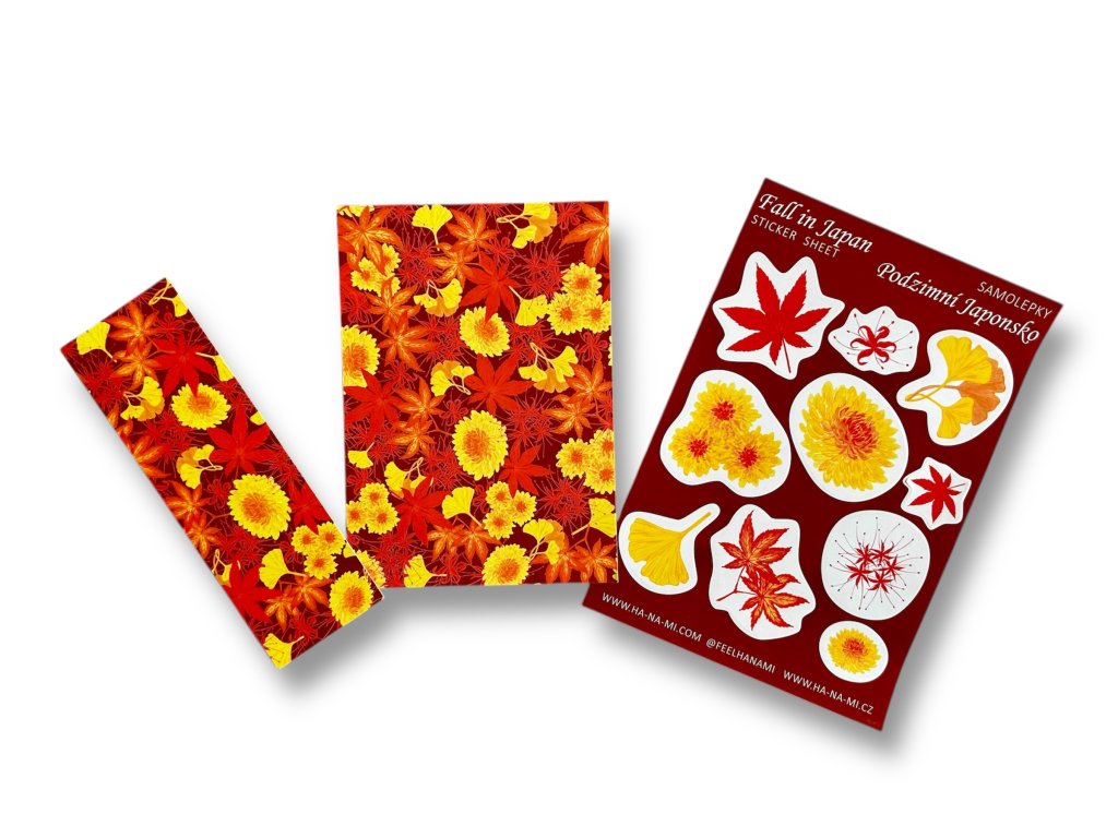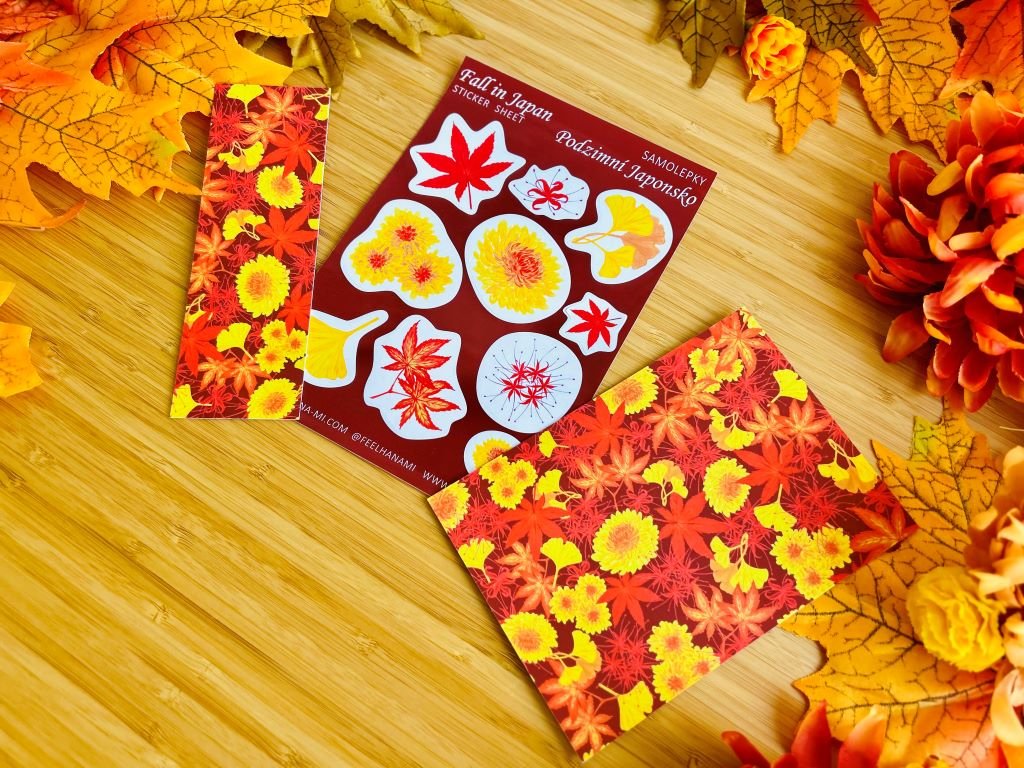 - Arch samolepek, pohlednice a záložka ozdobená reprodukcí mých akrylových maleb chryzantém, javorových listů, listů stromu ginkgo a pavoučí lilie