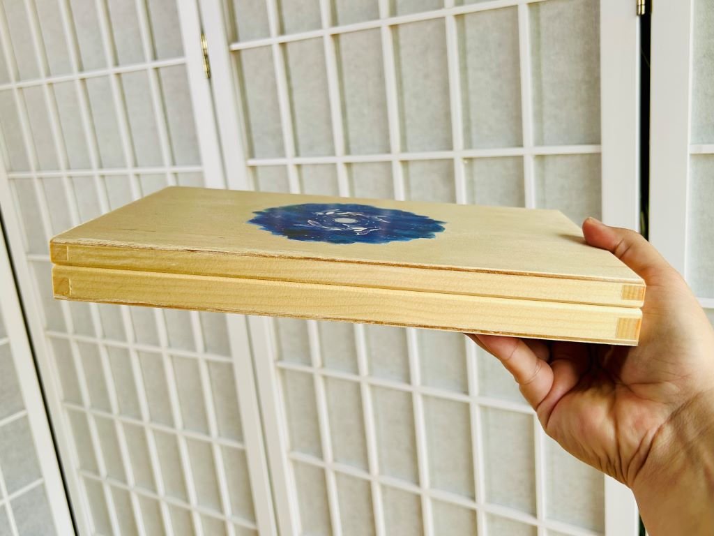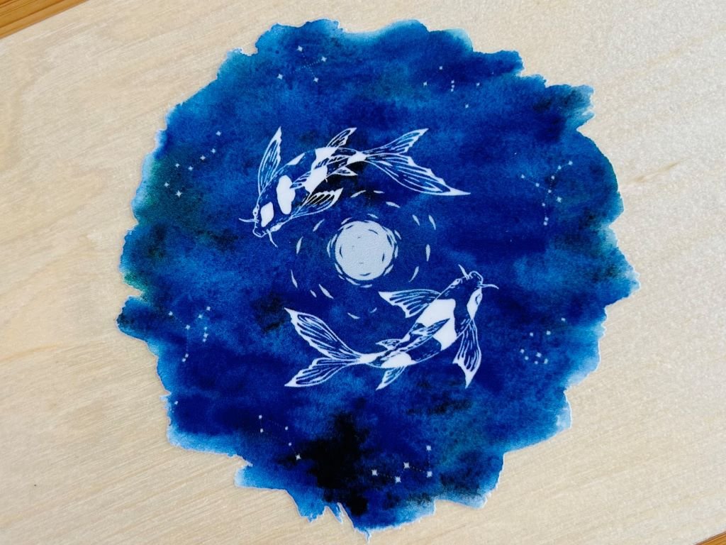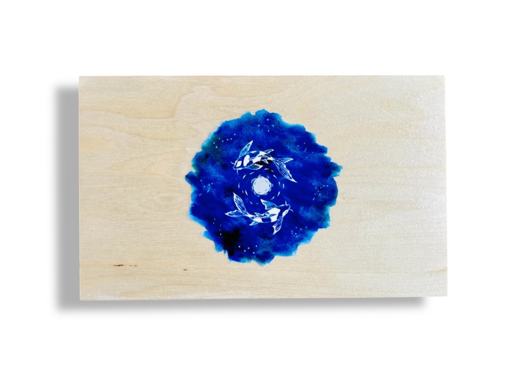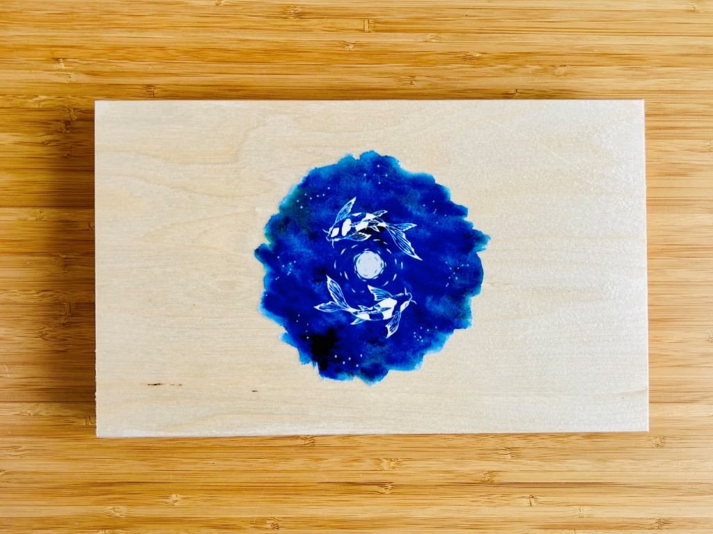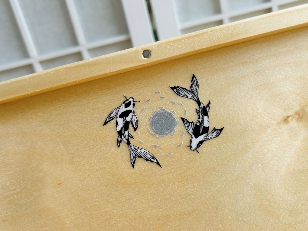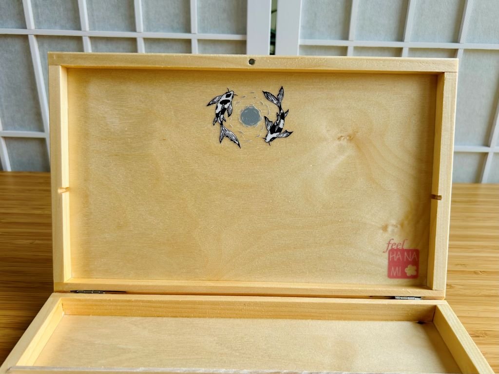 - praktická, a zároveň elegantní, dřevěná krabička ozdobená reprodukcí mých akrylových maleb koi kapříků a odrazu měsíce na vodní hladině