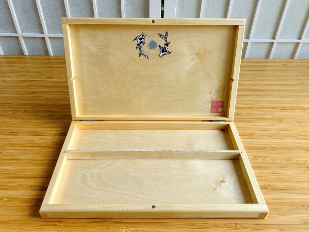 - dřevěnou krabičku jsem nechala vyrobit na míru tak, aby se do ní pohodlně vešly vaše jídelní hůlky i s odkladači na hůlky (hashioki)