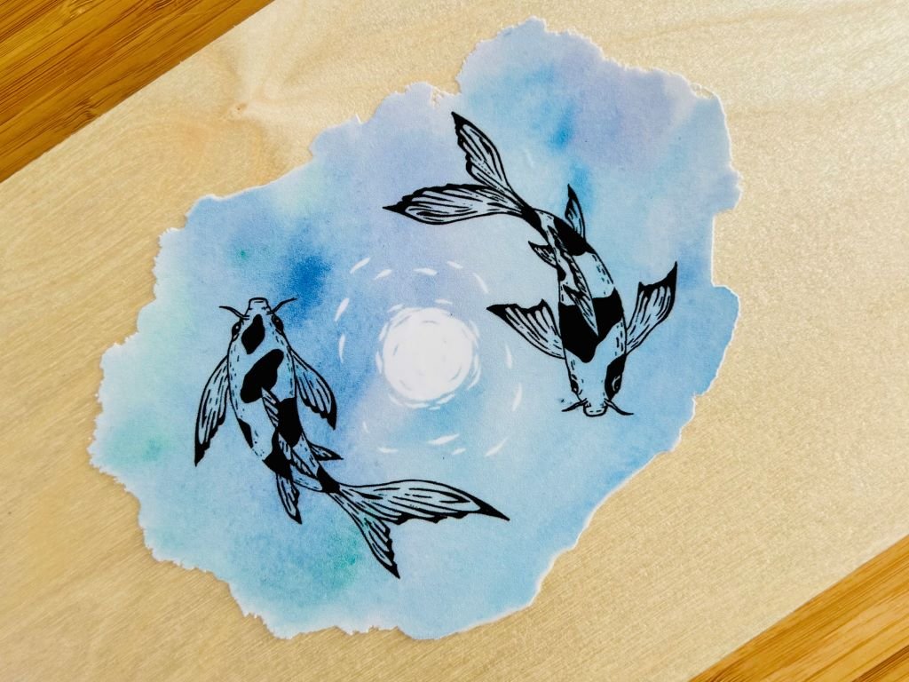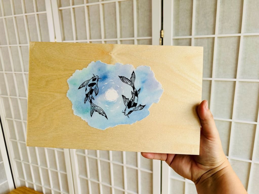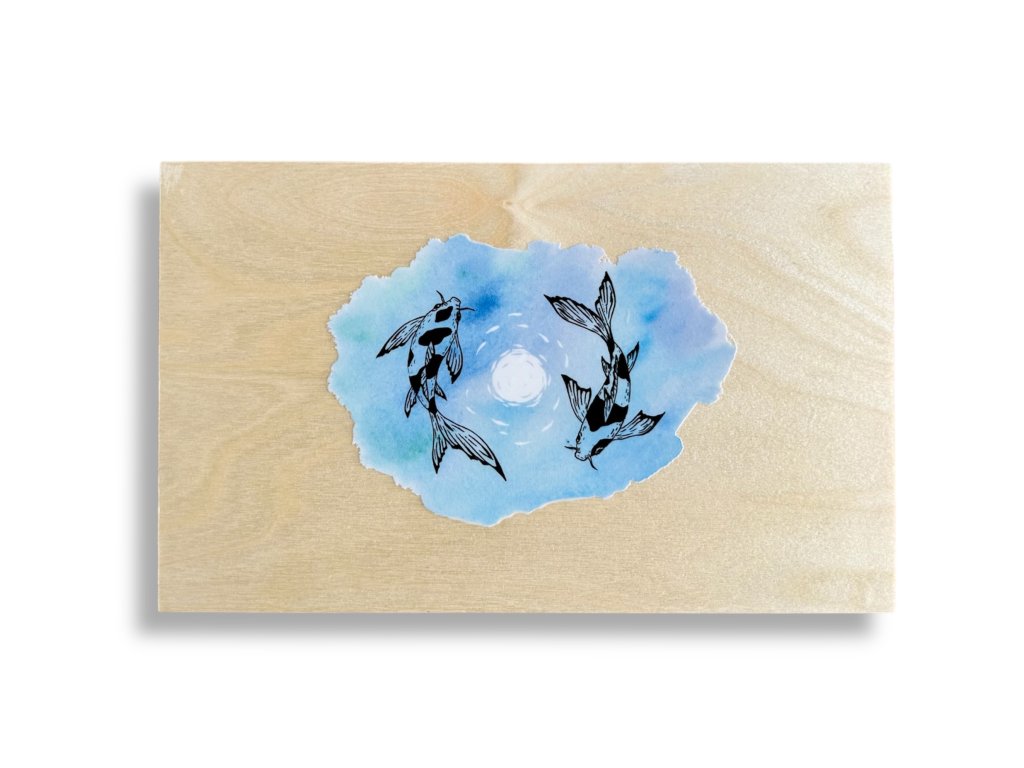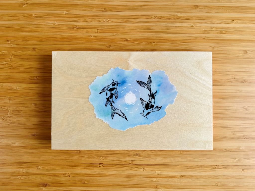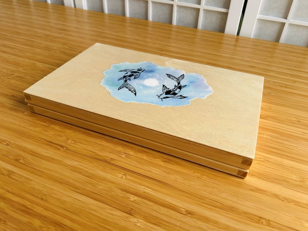 - praktická, a zároveň elegantní, dřevěná krabička ozdobená reprodukcí mých akrylových maleb koi kapříků a odrazu měsíce na vodní hladině