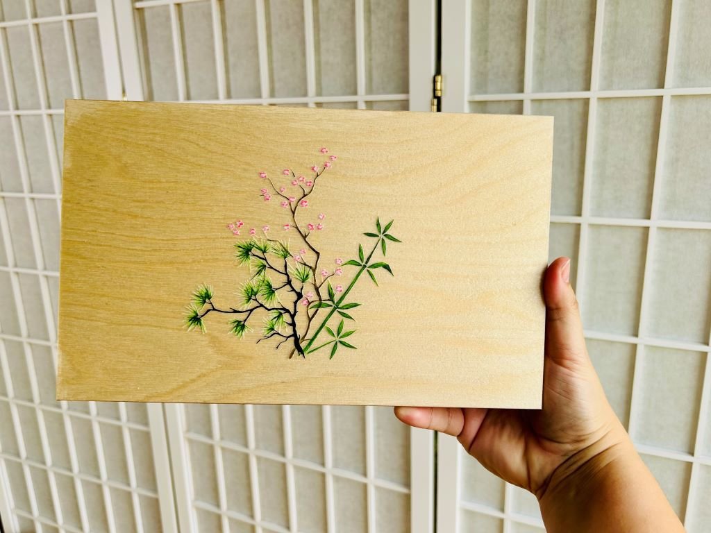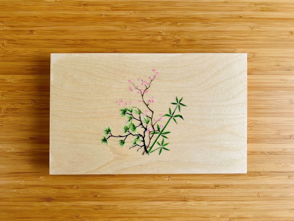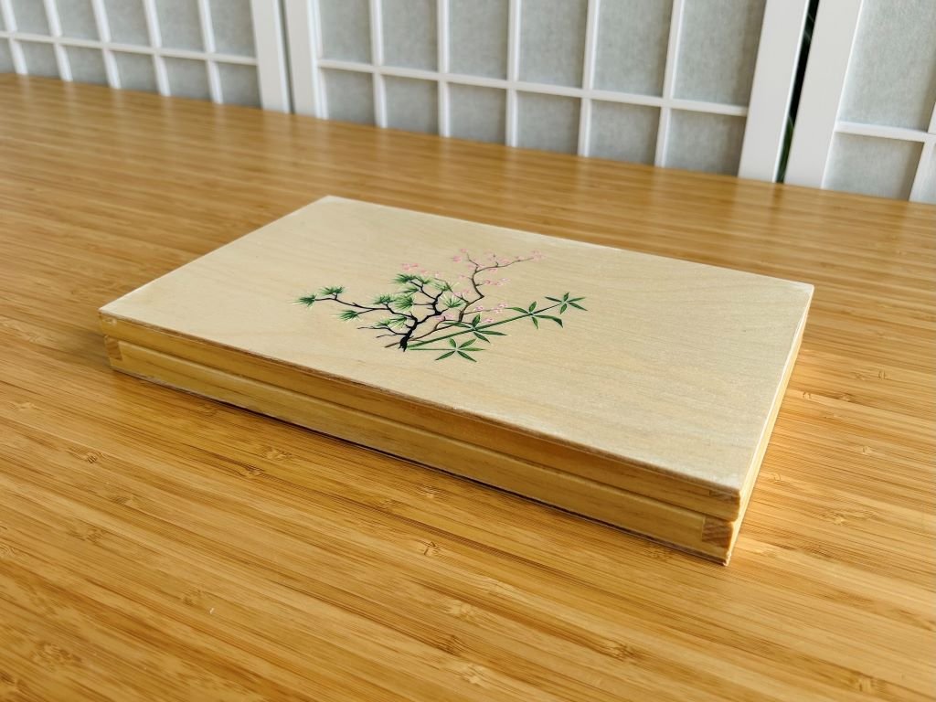 Dřevěná krabička na jídelní hůlky a odkladače s bambusem, borovicí a slivoní nebo-li Třemi přáteli zimy
