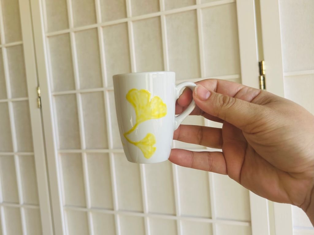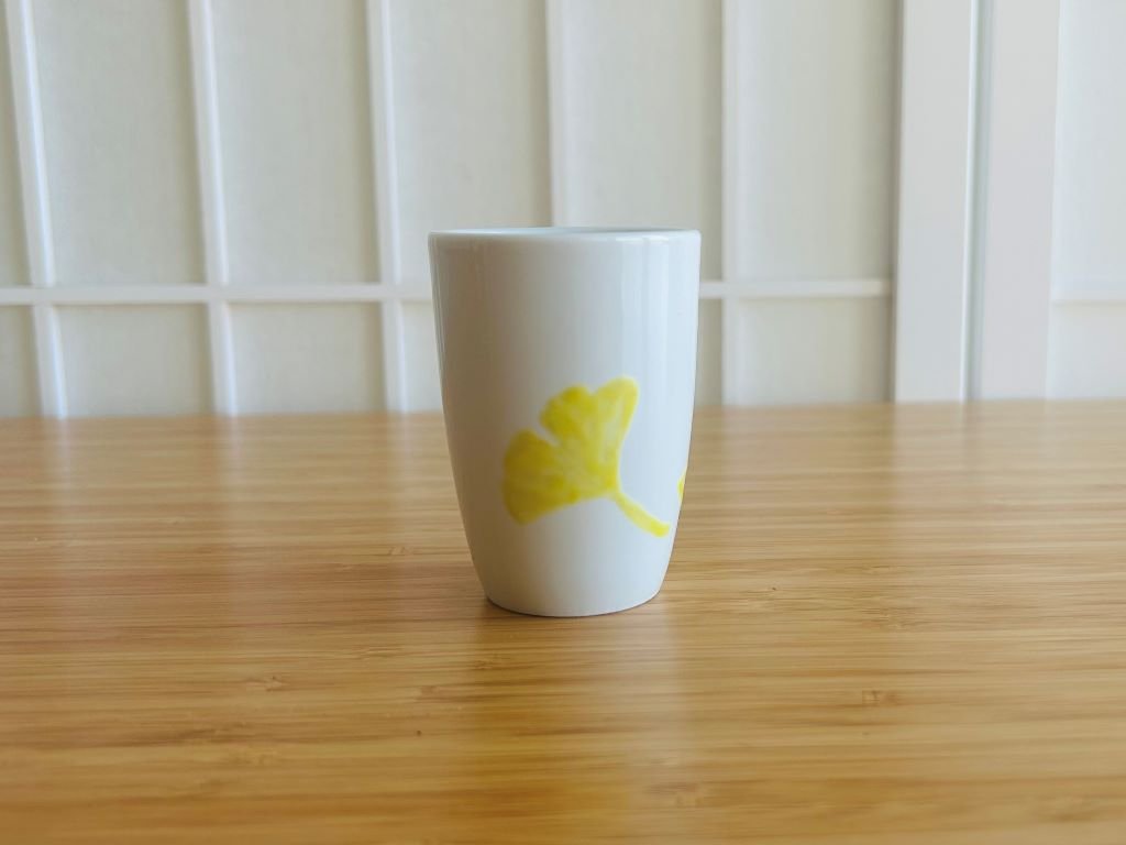 - porcelánový hrneček na espresso ozdobený ruční malbou ginkdo listů