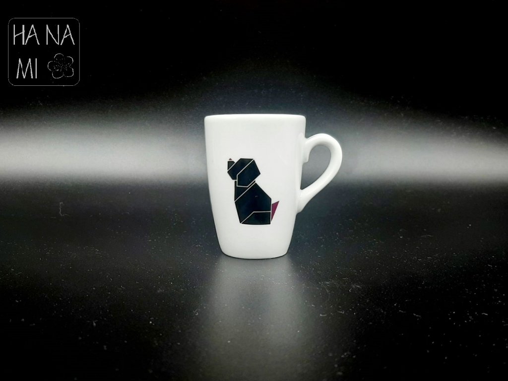 - porcelánový hrnek ozdobený dvoubarevnou origami skládankou štěněte