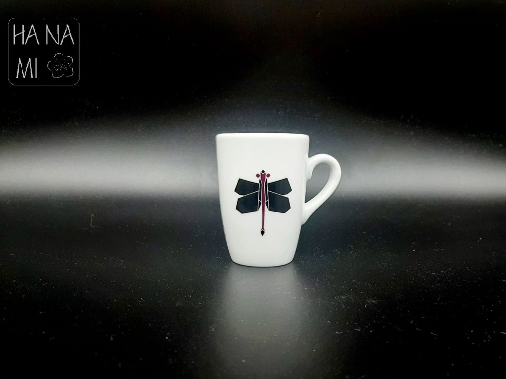 - porcelánový hrnek ozdobený dvoubarevnou origami skládankou vážky