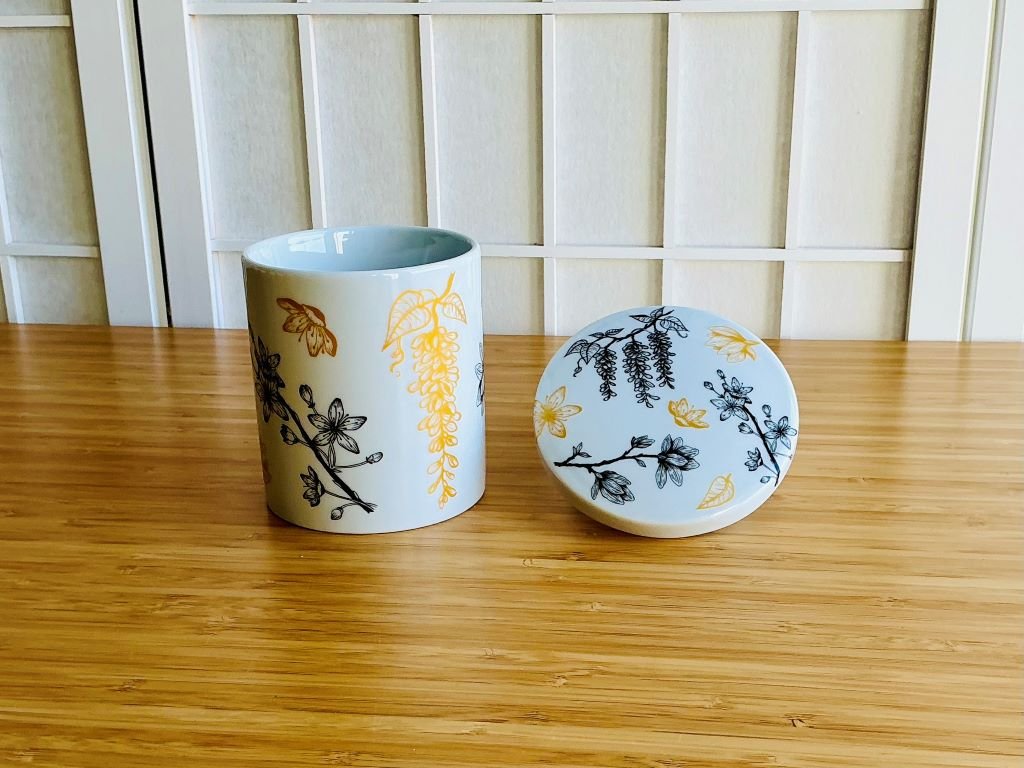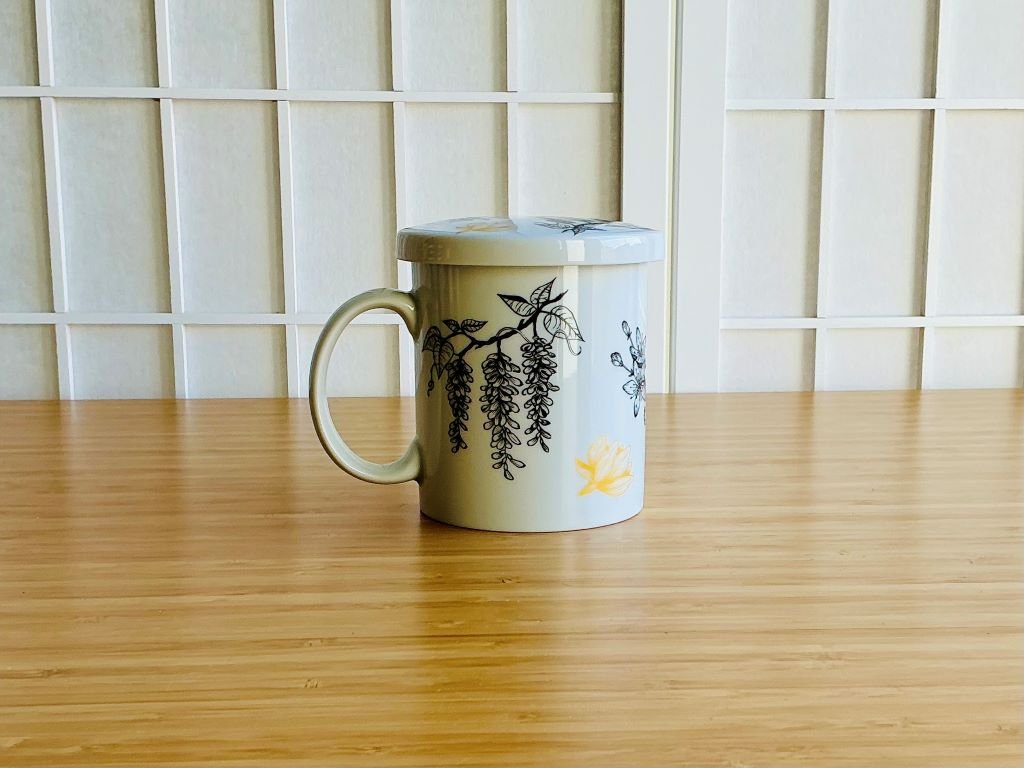 - porcelánový hrnek se sítkem a pokličkou ozdobený reprodukcí mých perokreseb kvetoucích sakur, magnolií a vistárií