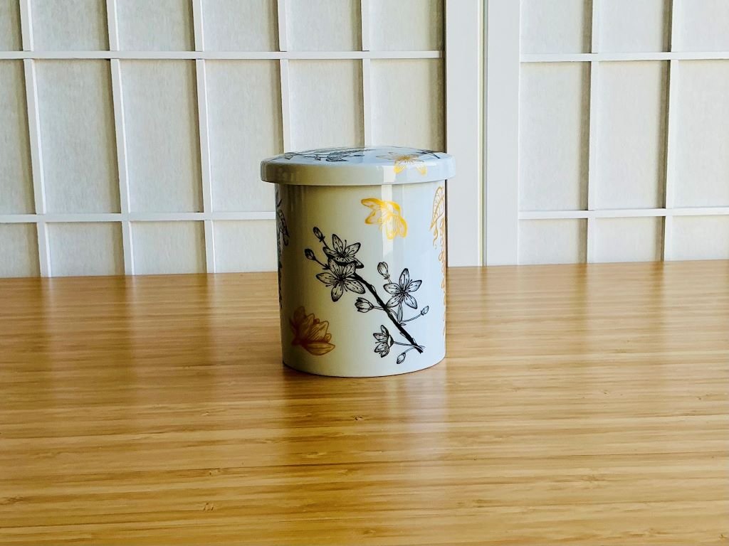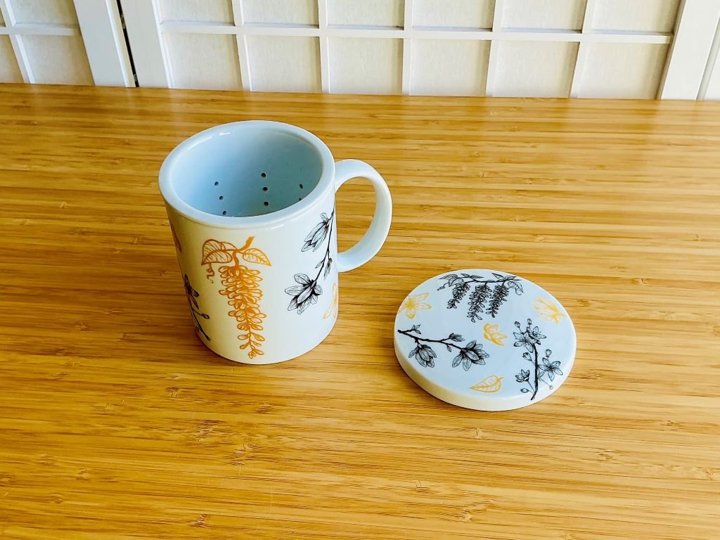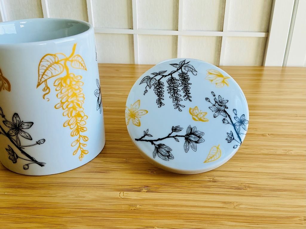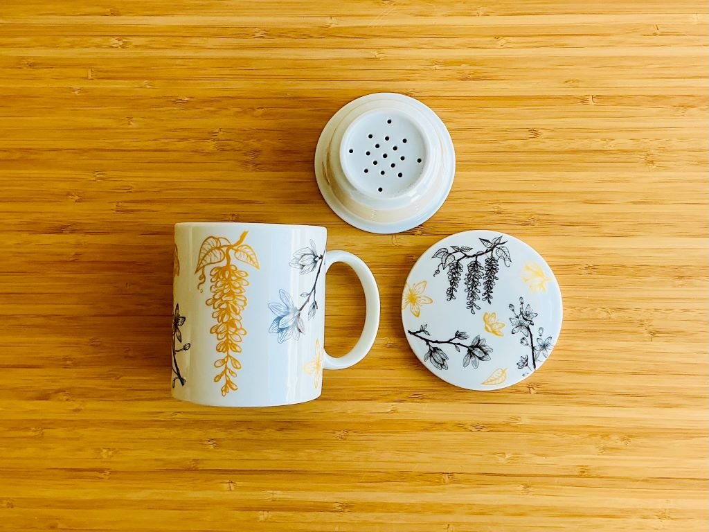 Porcelánový hrnek se sítkem a pokličkou se zlatou a černou sakurou, magnolií a vistárií