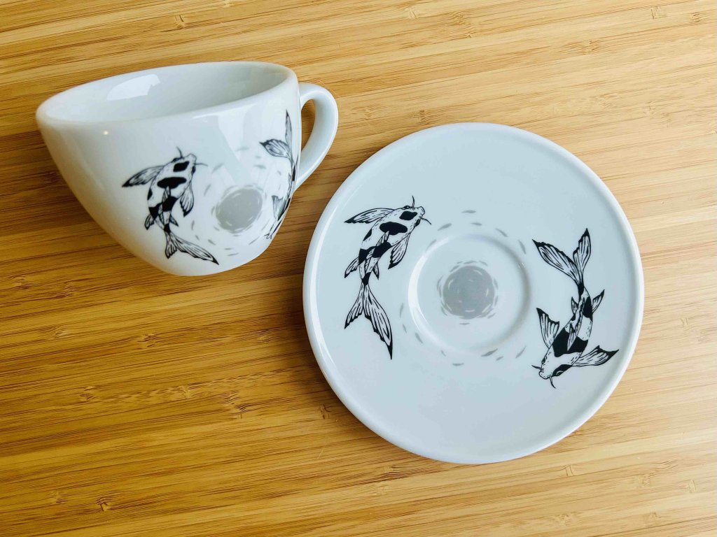 Porcelánový hrnek s podšálkem s koi kapry a odrazem měsíce na vodní hladině