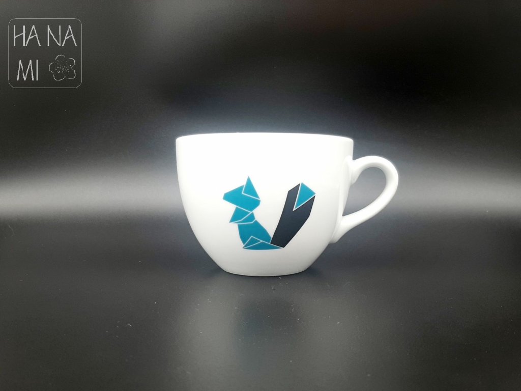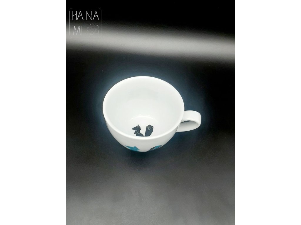 - porcelánový hrnek ozdobený dvoubarevnou origami skládankou veverky