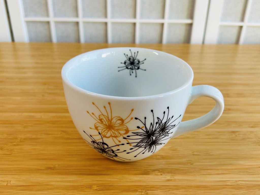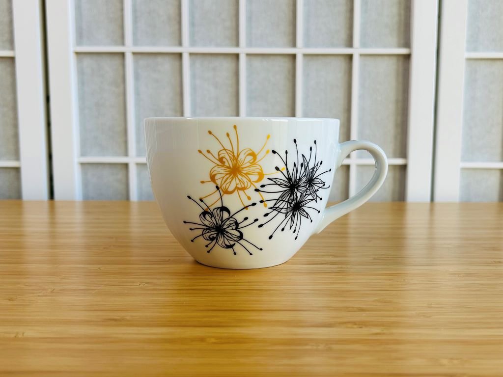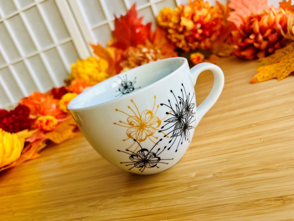 - hrnek je ručně ozdoben obtisky na porcelán, které byly vypáleny v keramické peci na 820 °C