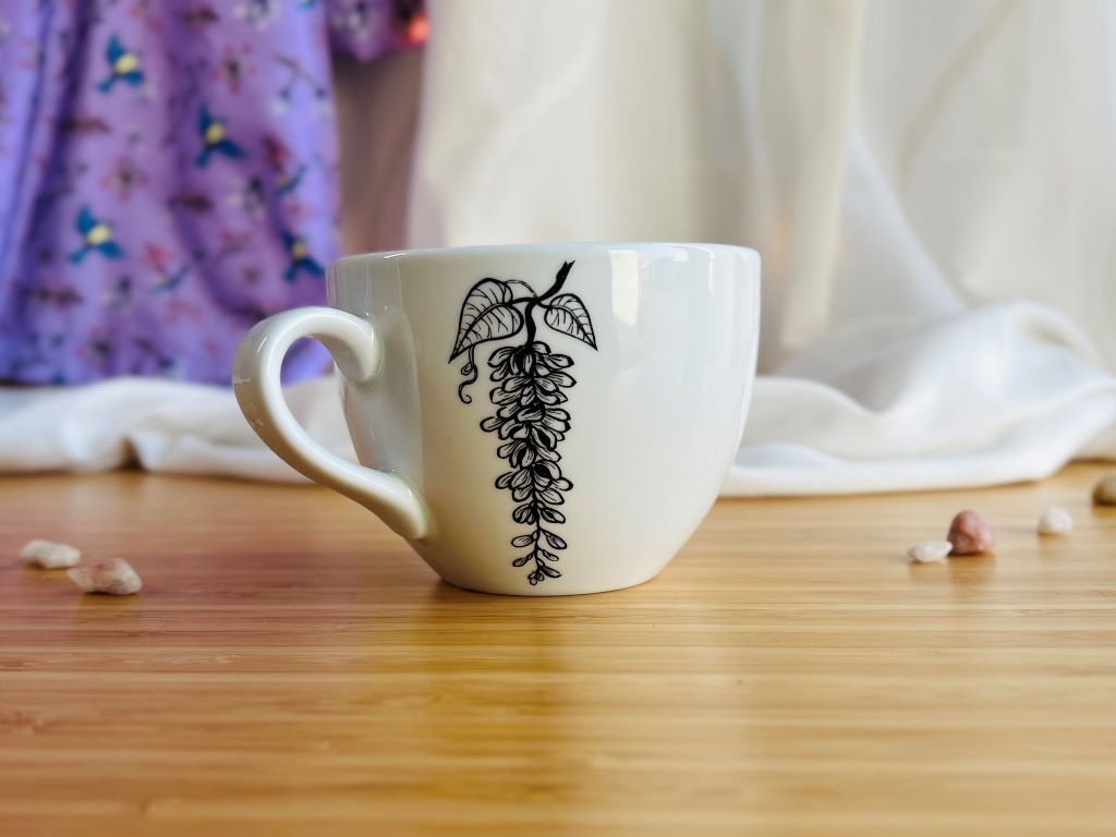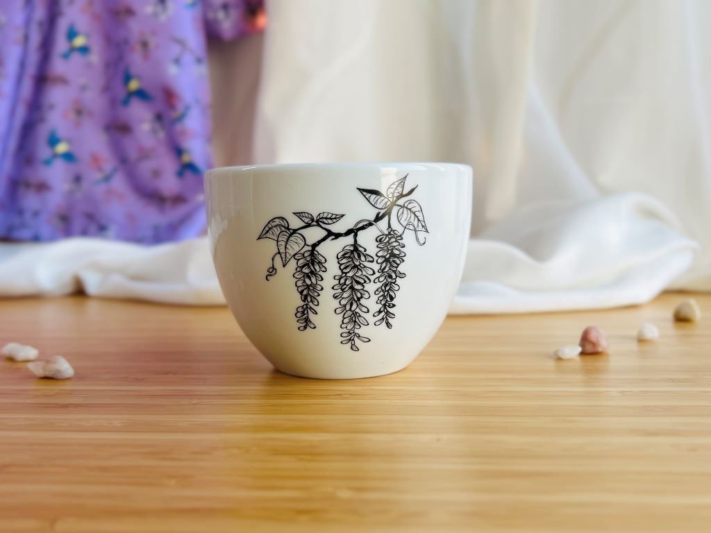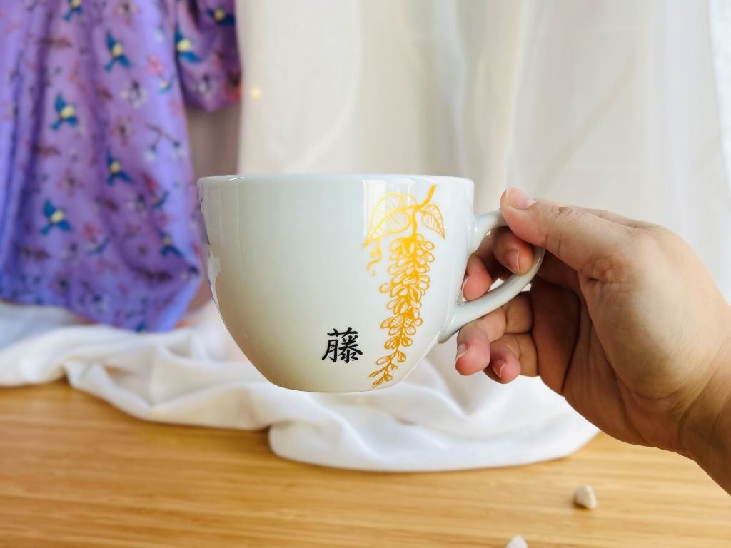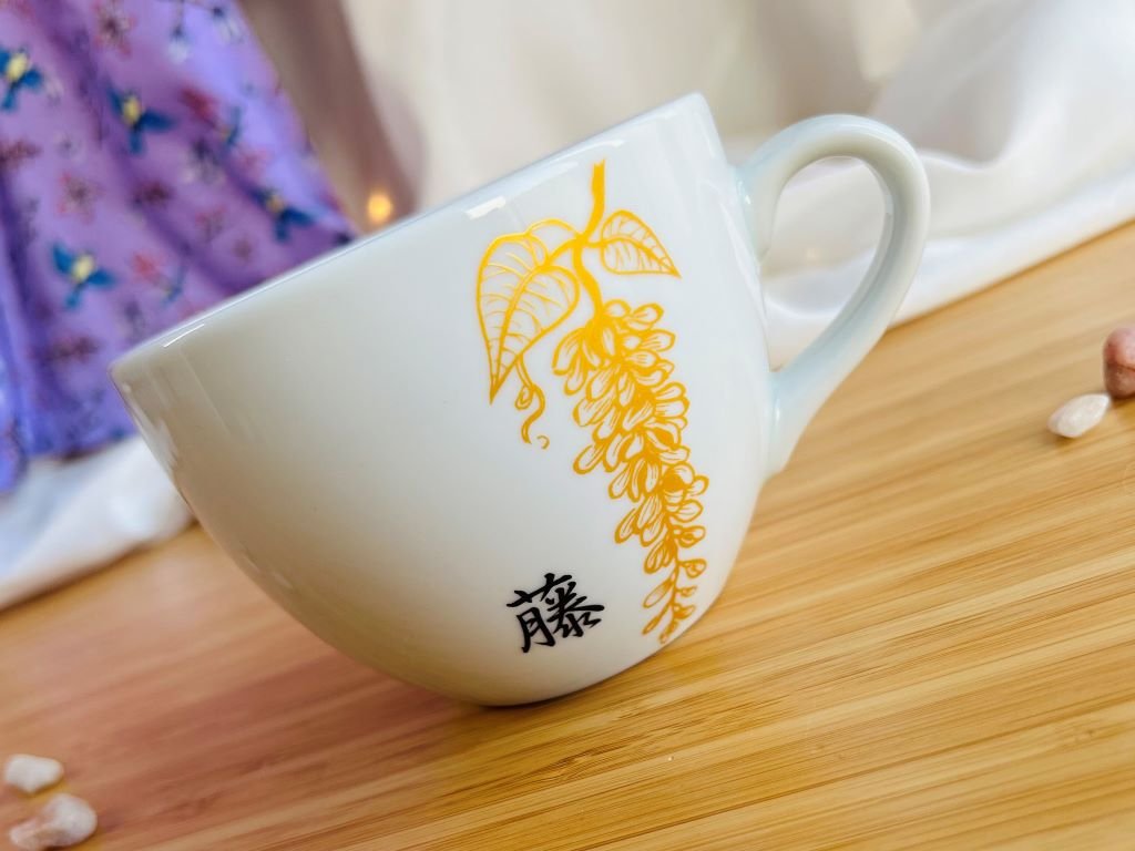 - na přední straně hrnku je japonský nápis "Vistárie".