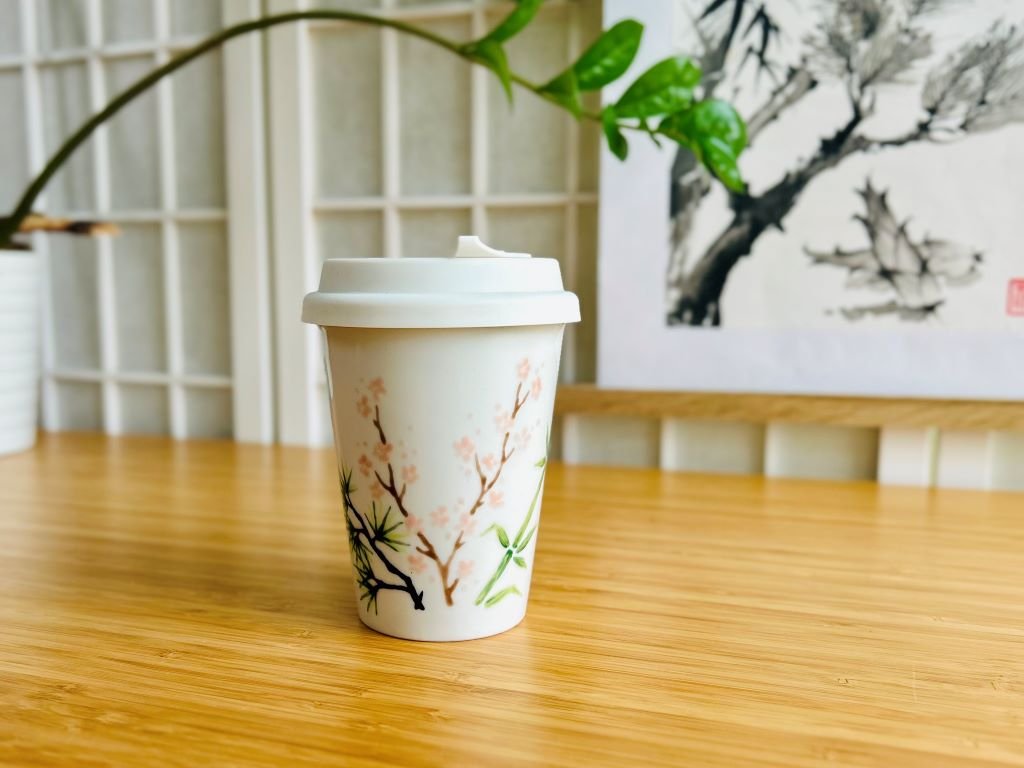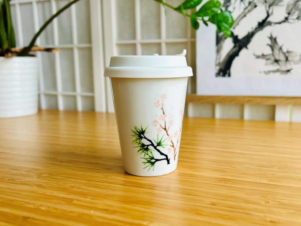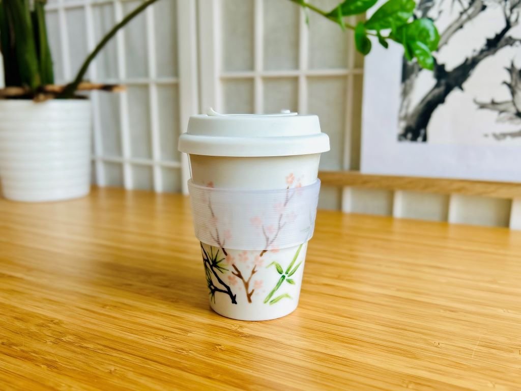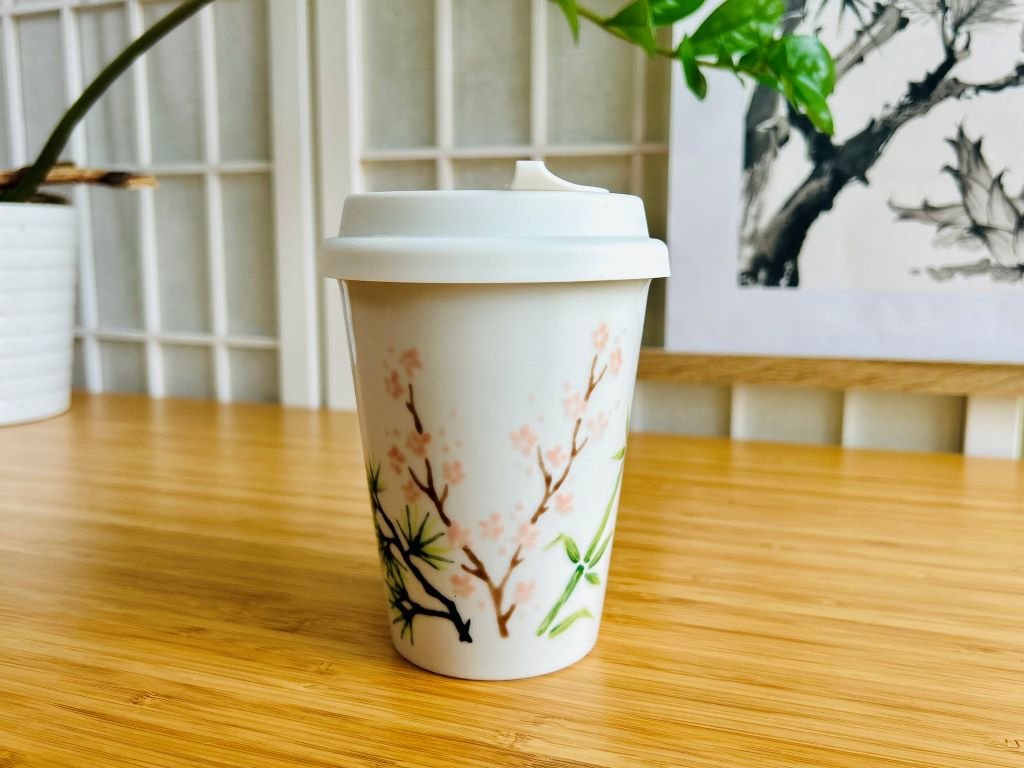 Porcelánový cestovní hrnek s bambusem, borovicí a slivoní