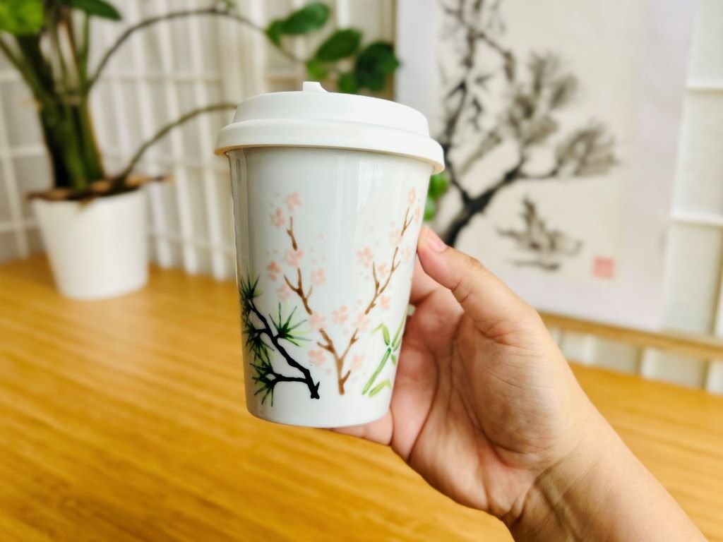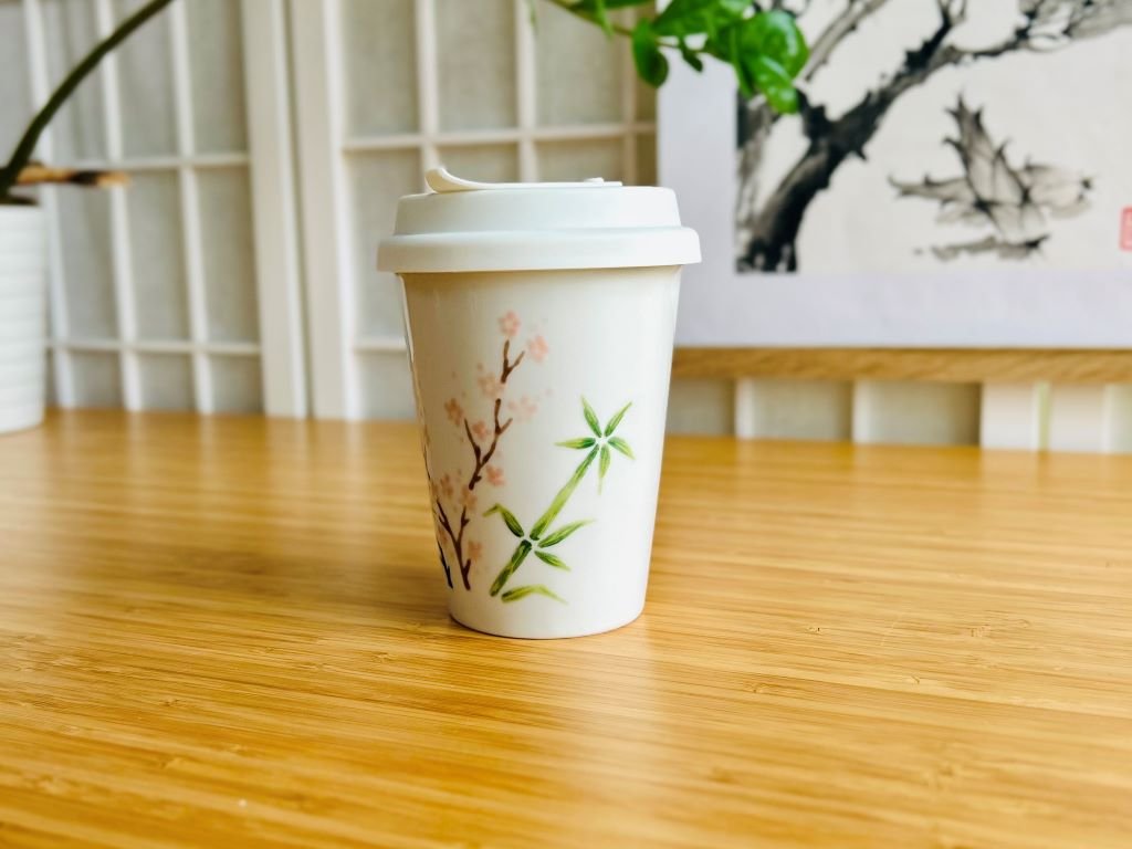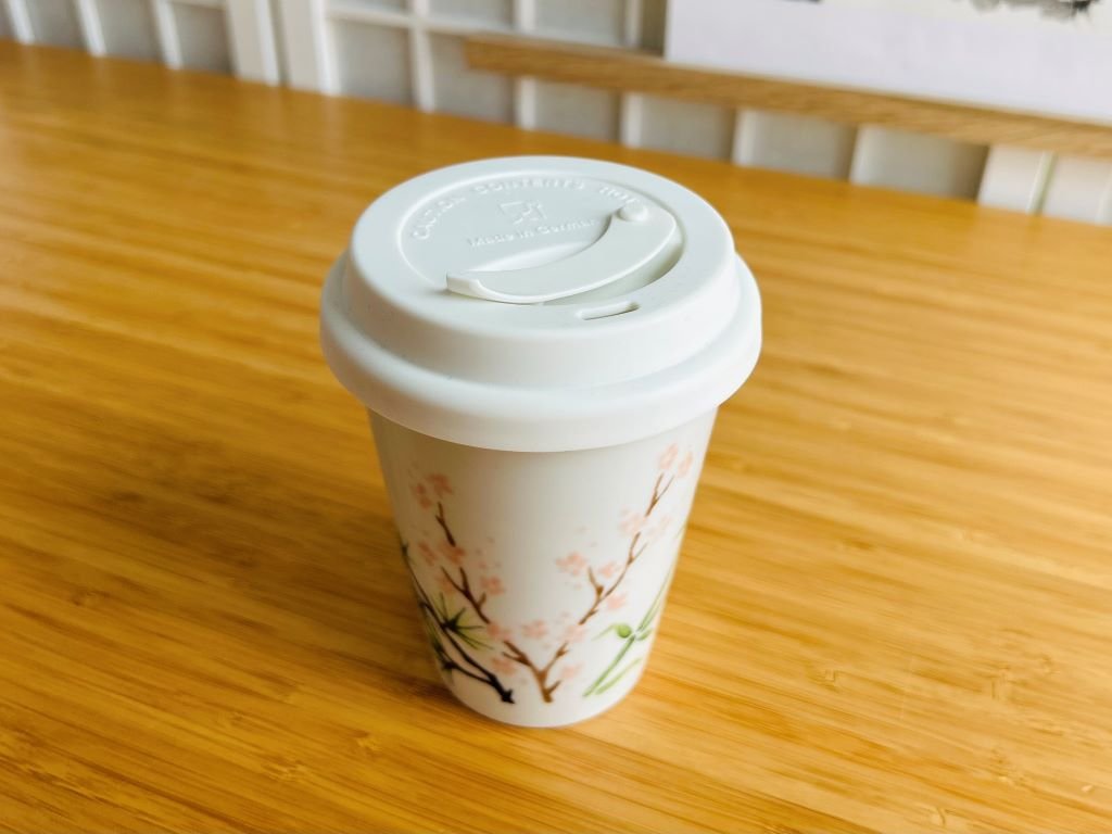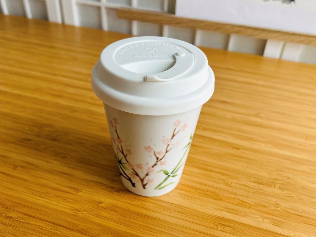 Porcelánový cestovní hrnek s bambusem, borovicí a slivoní