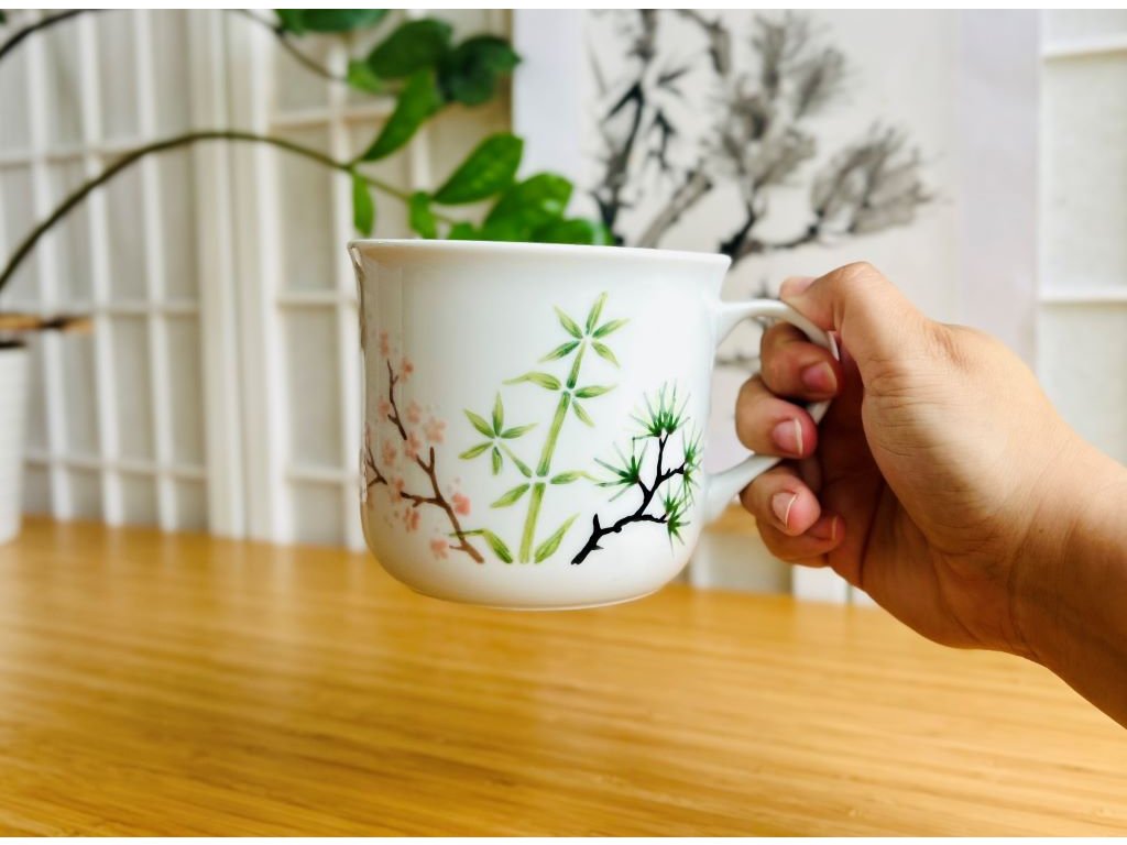 - Porcelánový hrnek ozdobený ruční malbou bambusu, borovice a slivoně
