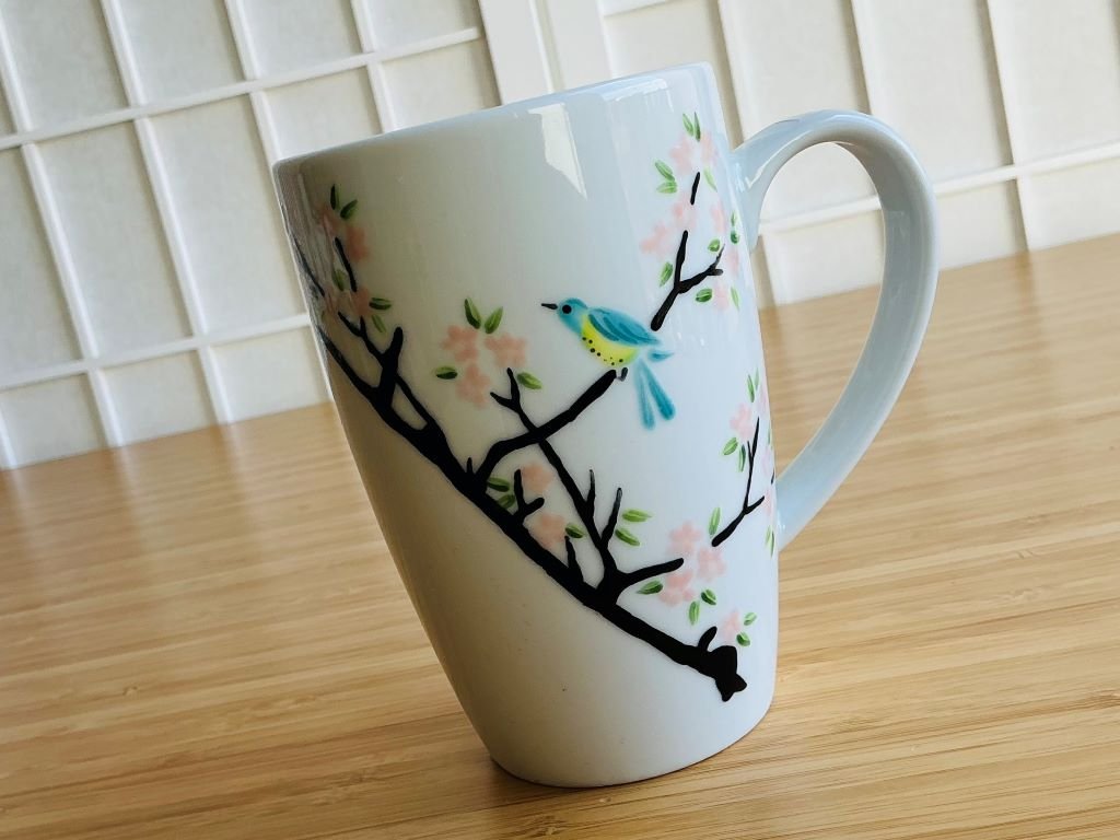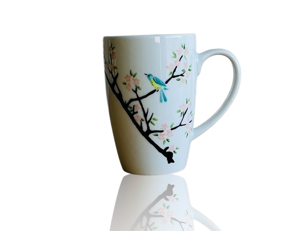 - Porcelánový hrnek ozdobený ruční malbou kvetoucích sakur s modrým ptáčkem