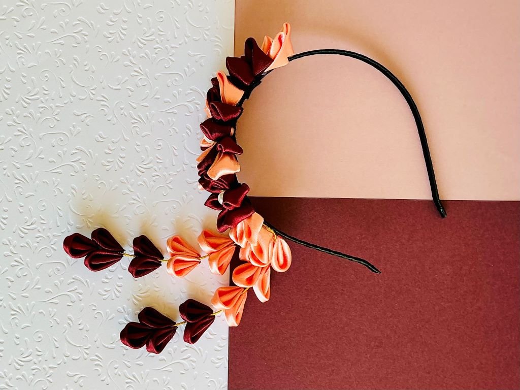 Čelenka ozdobená květinou z látkových stužek, která byla vyrobená japonskou tradiční technikou kanzashi.
