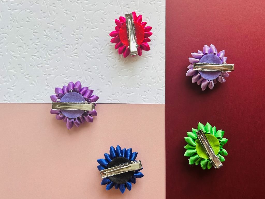 Květina je vyrobená tradiční japonskou technikou kanzashi od tvůrkyně Ayu-kanzashi.
