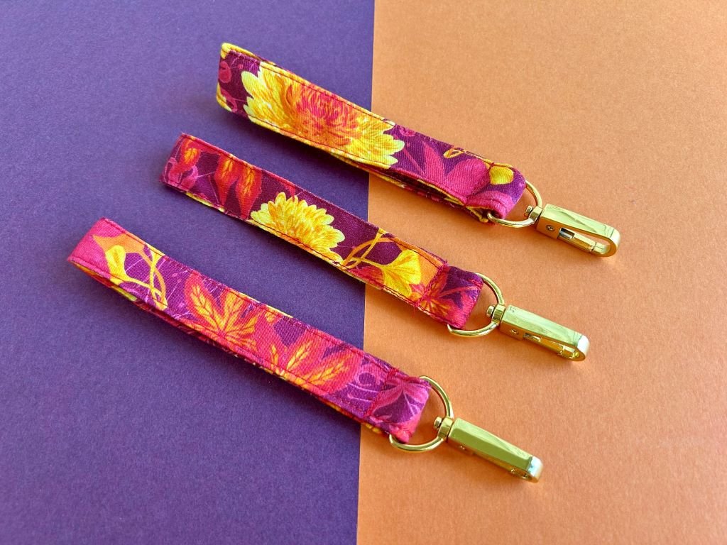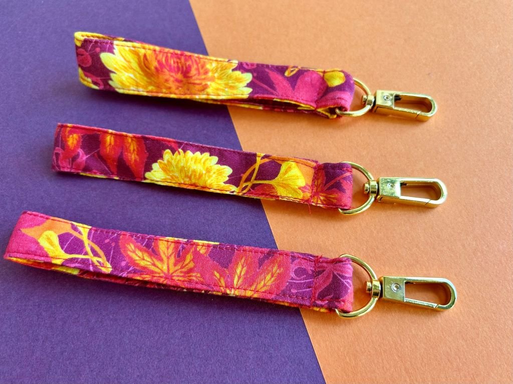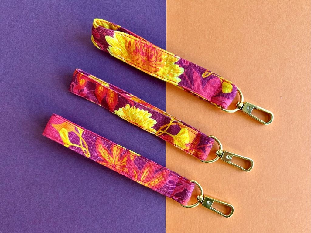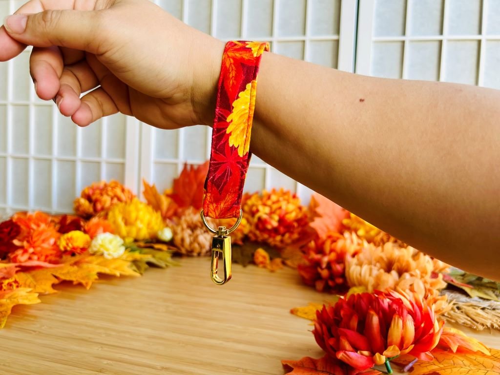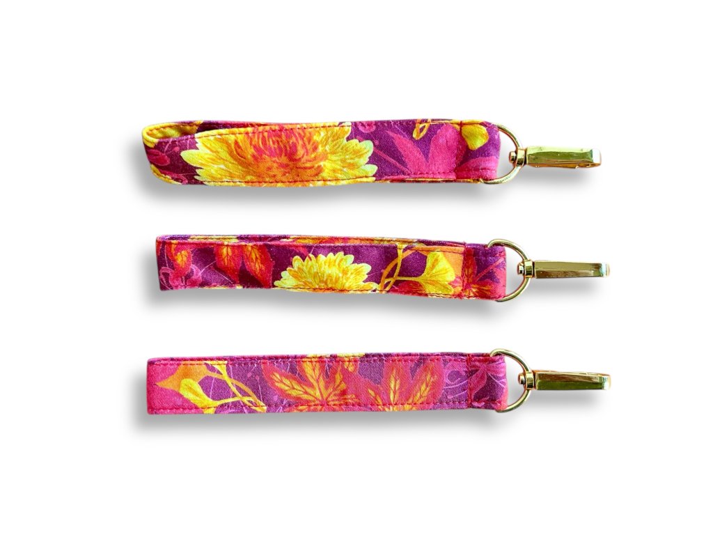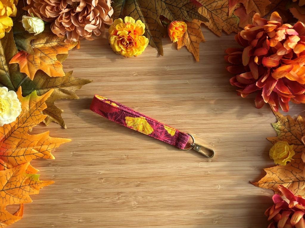 Praktická klíčenka plná kvetoucích chryzantém, javorových listů, listů stromu ginkgo a pavoučích lilií