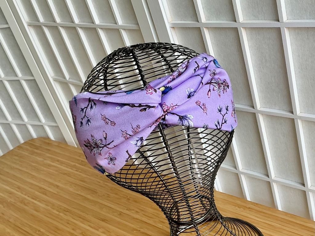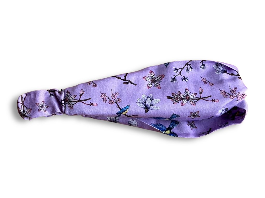 Látková čelenka plná kvetoucích sakur a magnolií... a nesmí chybět ani modrý ptáček