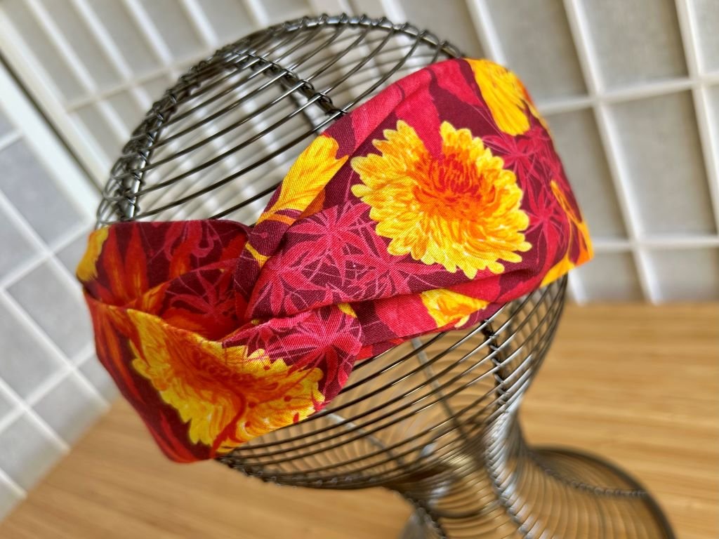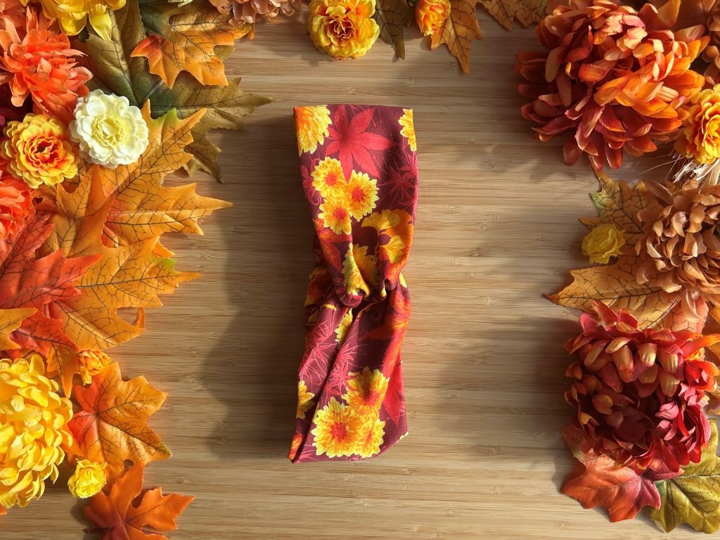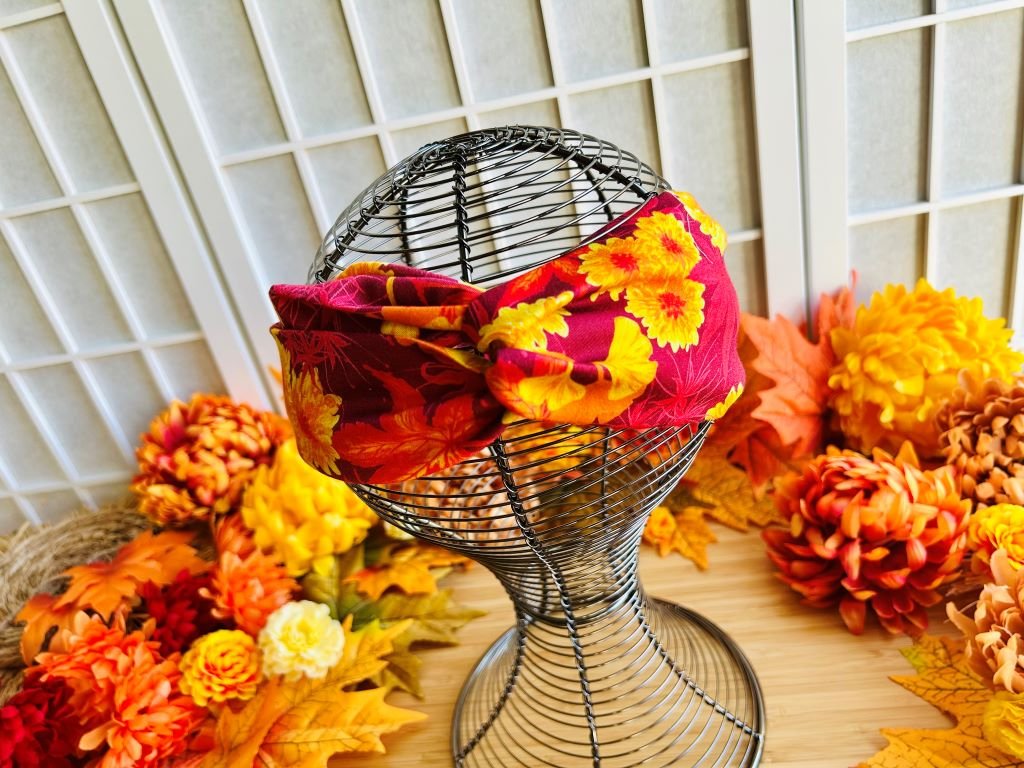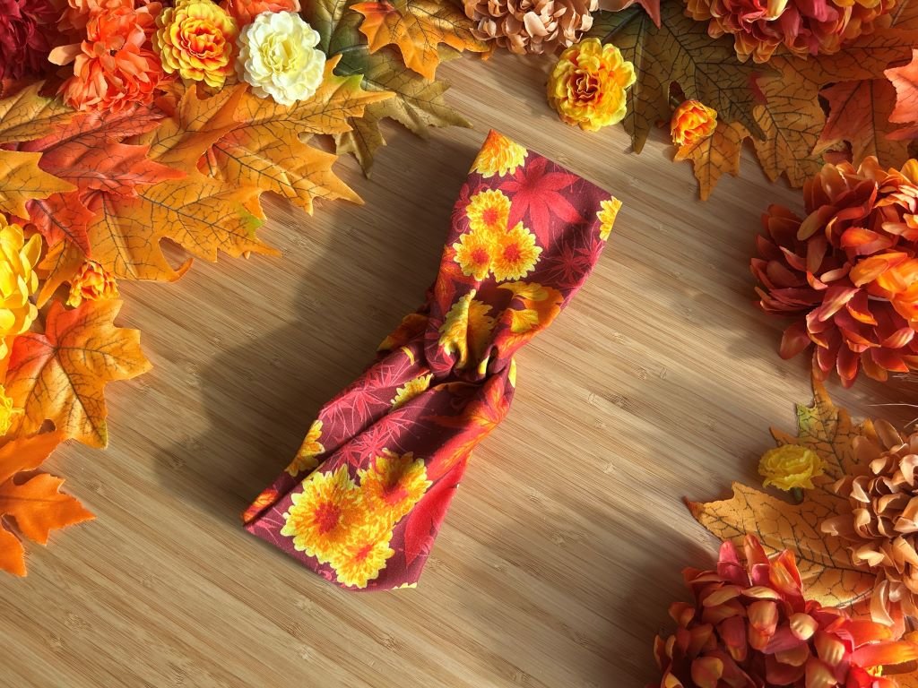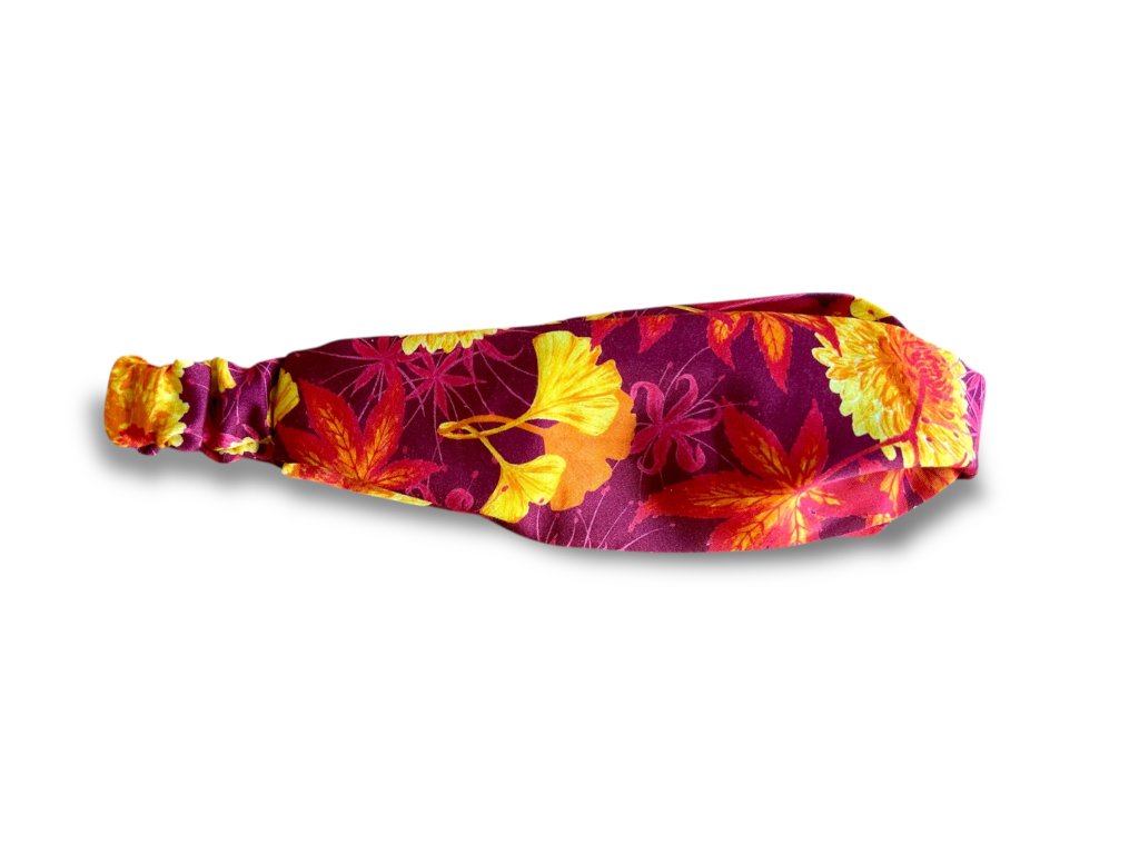 Látková čelenka plná kvetoucích chryzantém, javorových listů, listů stromu ginkgo a pavoučích lilií