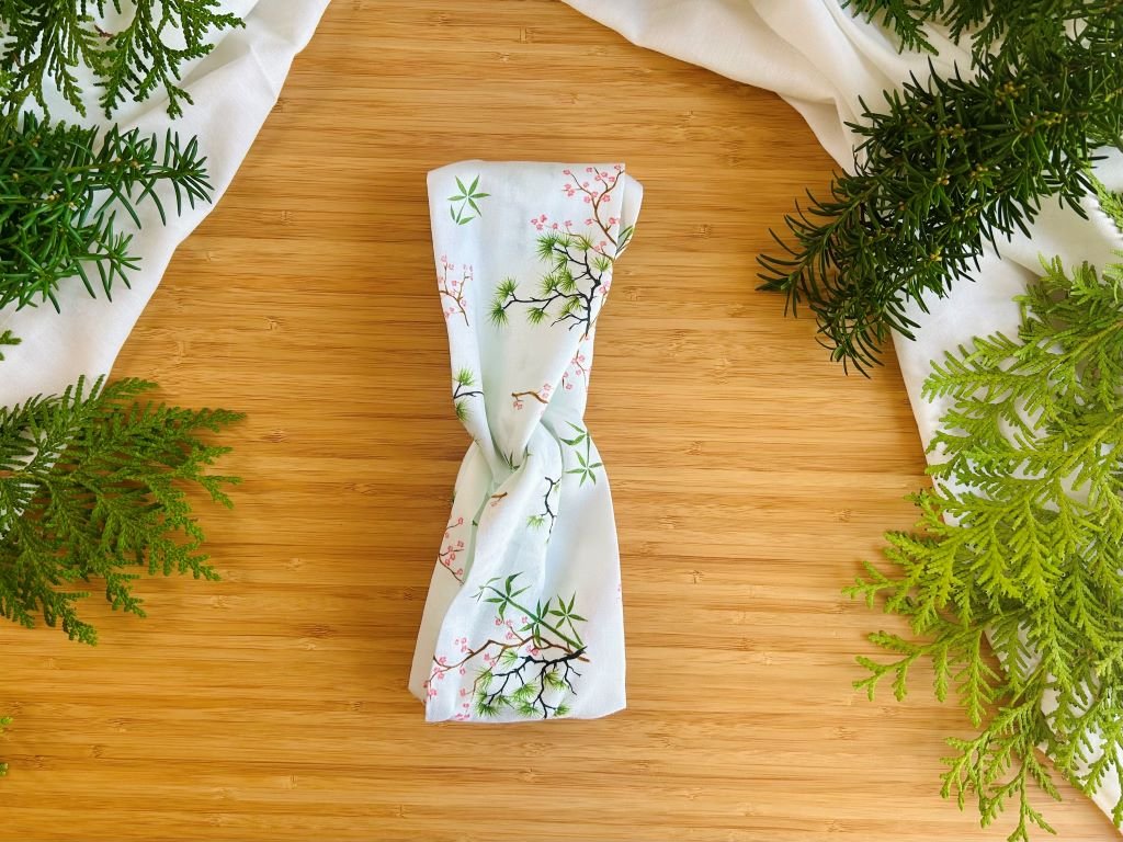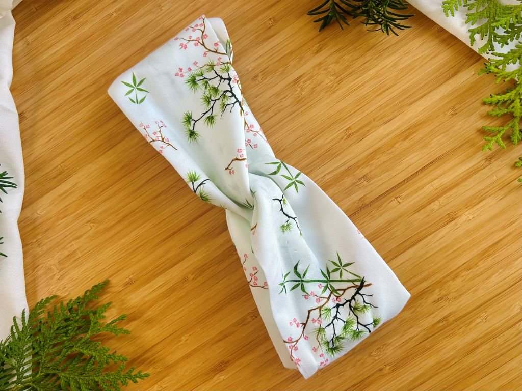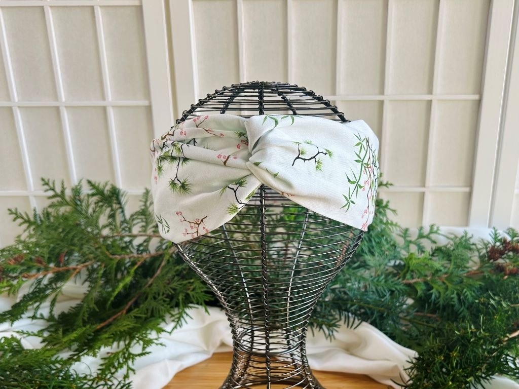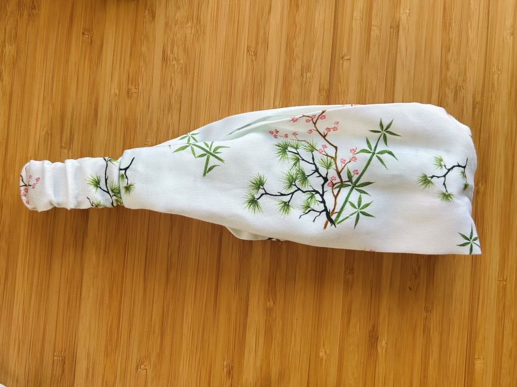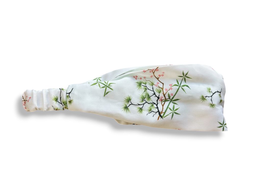 Látková čelenka s gumičkou s bambusem, borovicí a slivoní nebo-li Třemi přáteli zimy