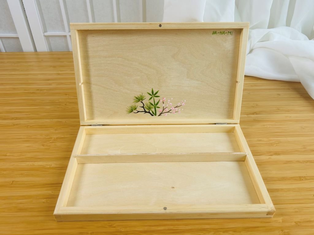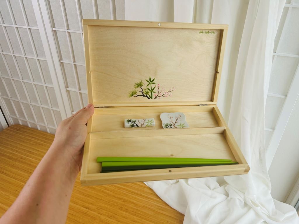 - dřevěnou krabičku jsem nechala vyrobit na míru tak, aby se do ní pohodlně vešly vaše jídelní hůlky i s odkladači na hůlky (hashioki)