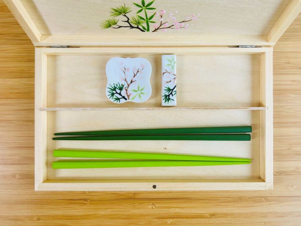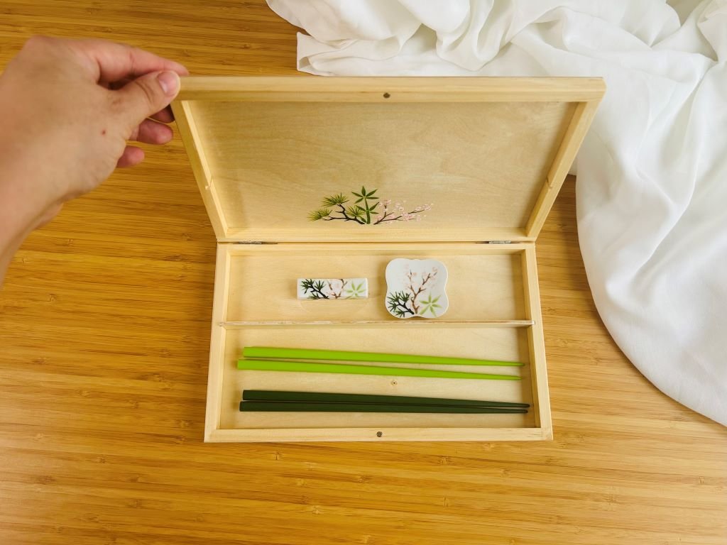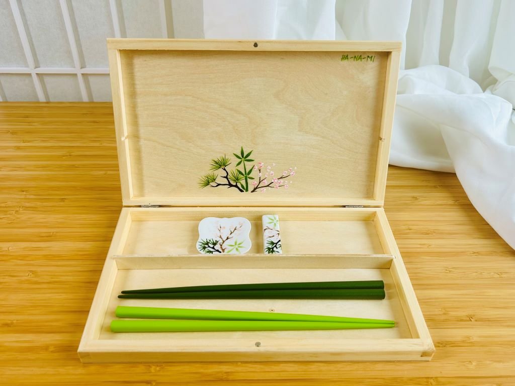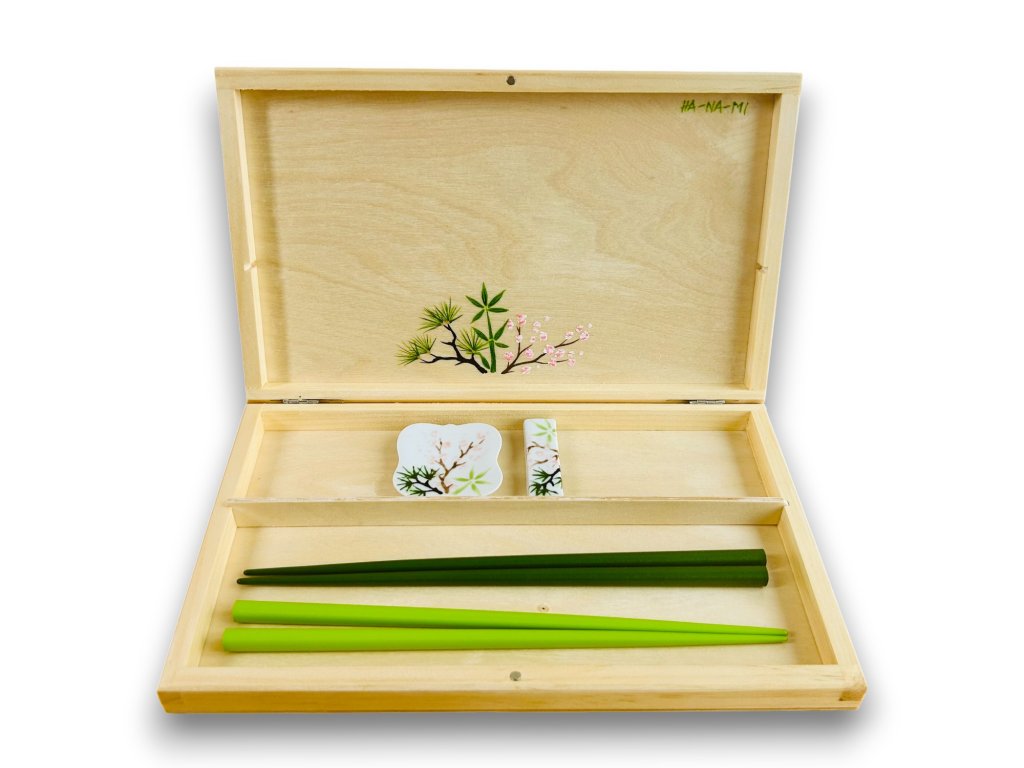 Dárková sada s dřevěnou krabičkou, 2 odkladači na hůlky (hashioki) a 2 jídelními hůlkami