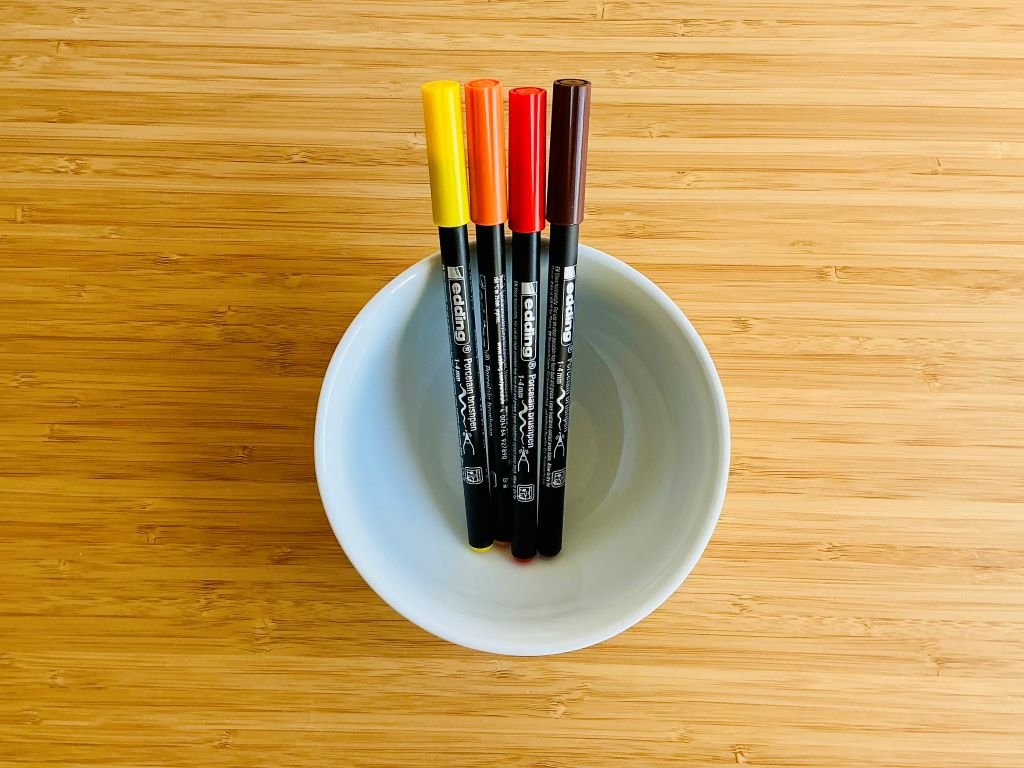 - žlutá, oranžová, hnědá a červená fixa