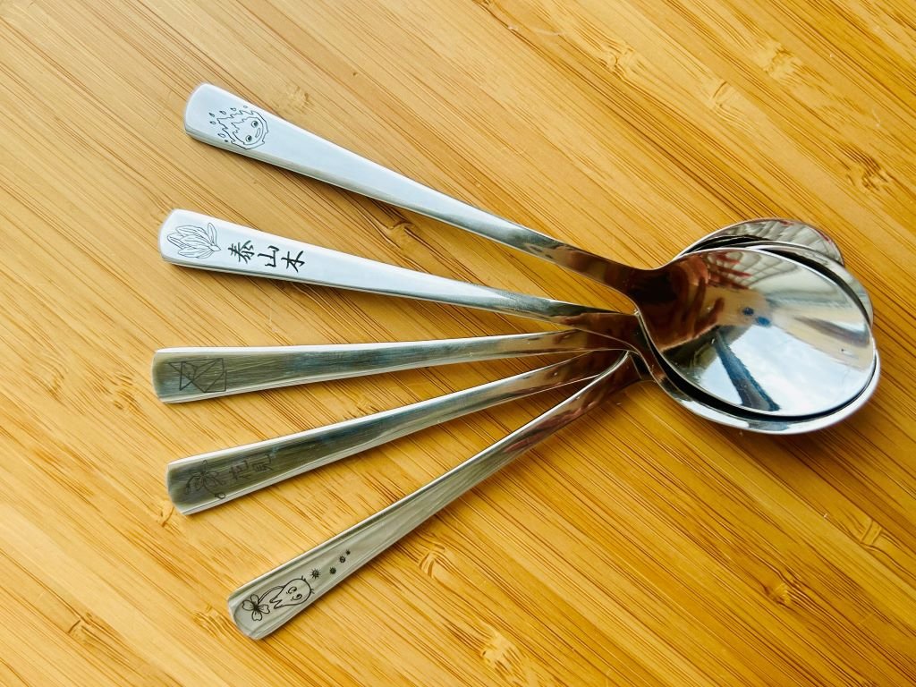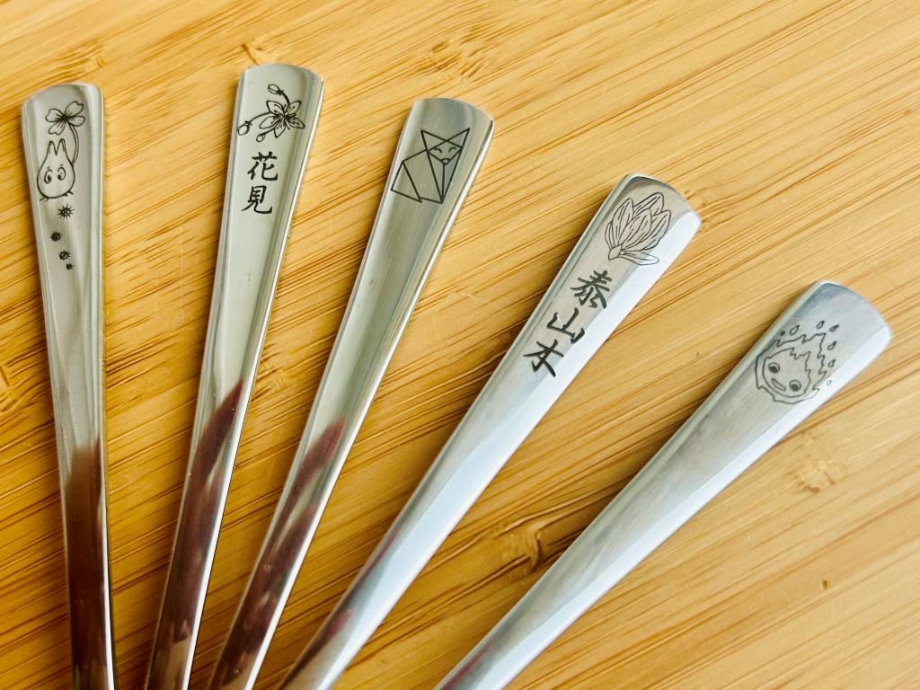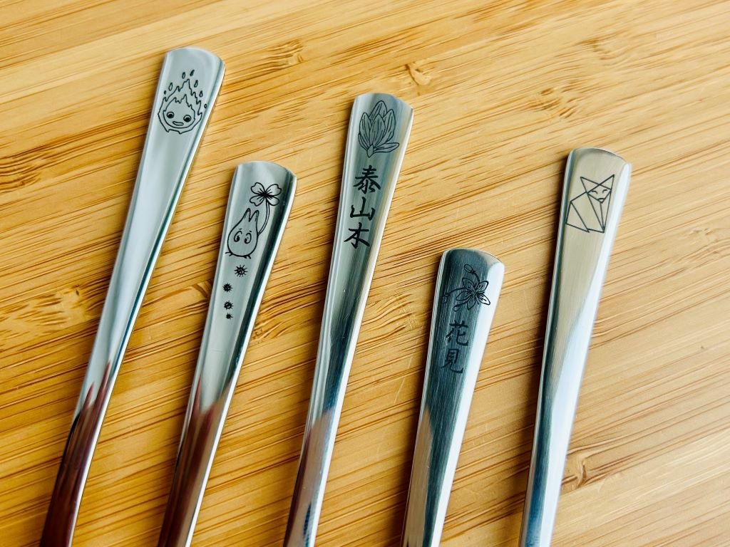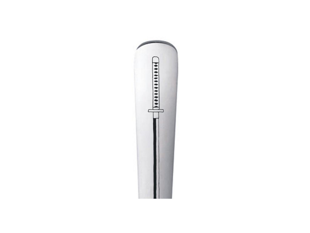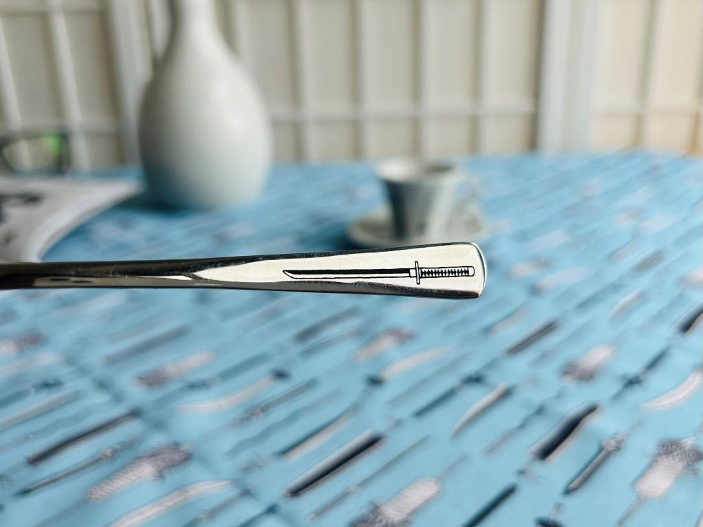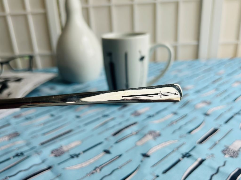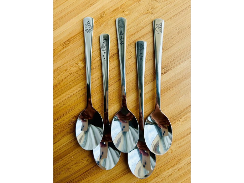 - Nerezová lžička ozdobená gravírováním mé perokresby japonského meče ze známého animovaného seriálu