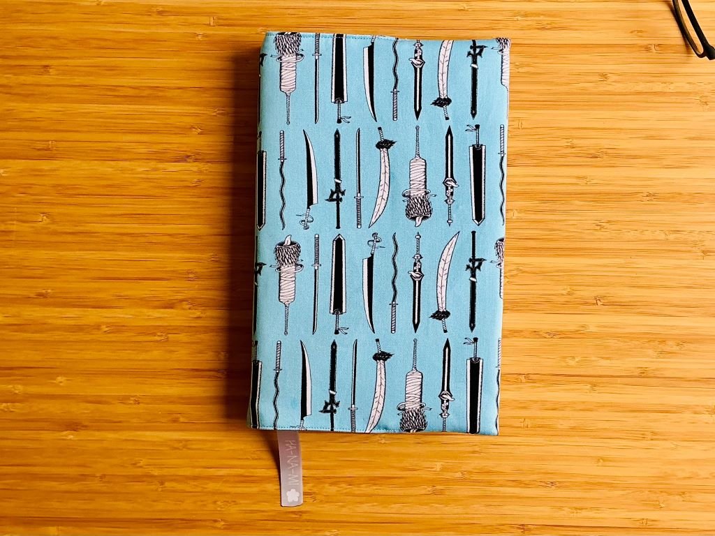 - praktický velký textilní obal na knihu ozdobený reprodukcí mých akrylových maleb a perokreseb mečů ze známých anime seriálů