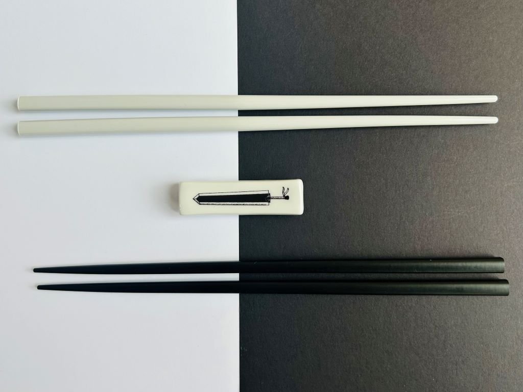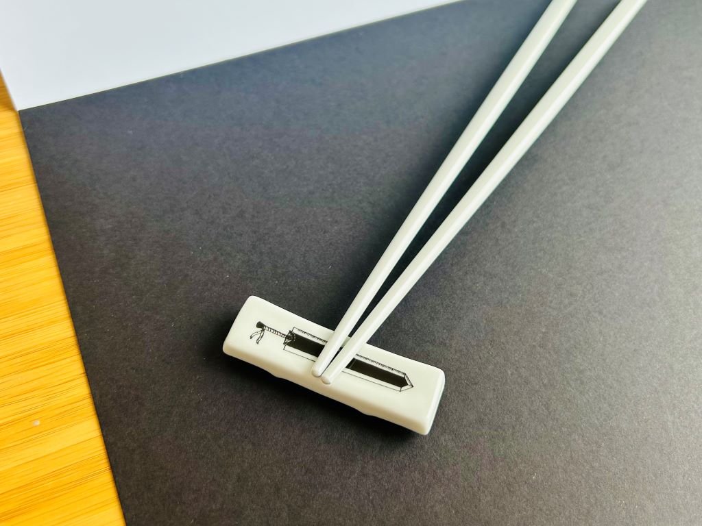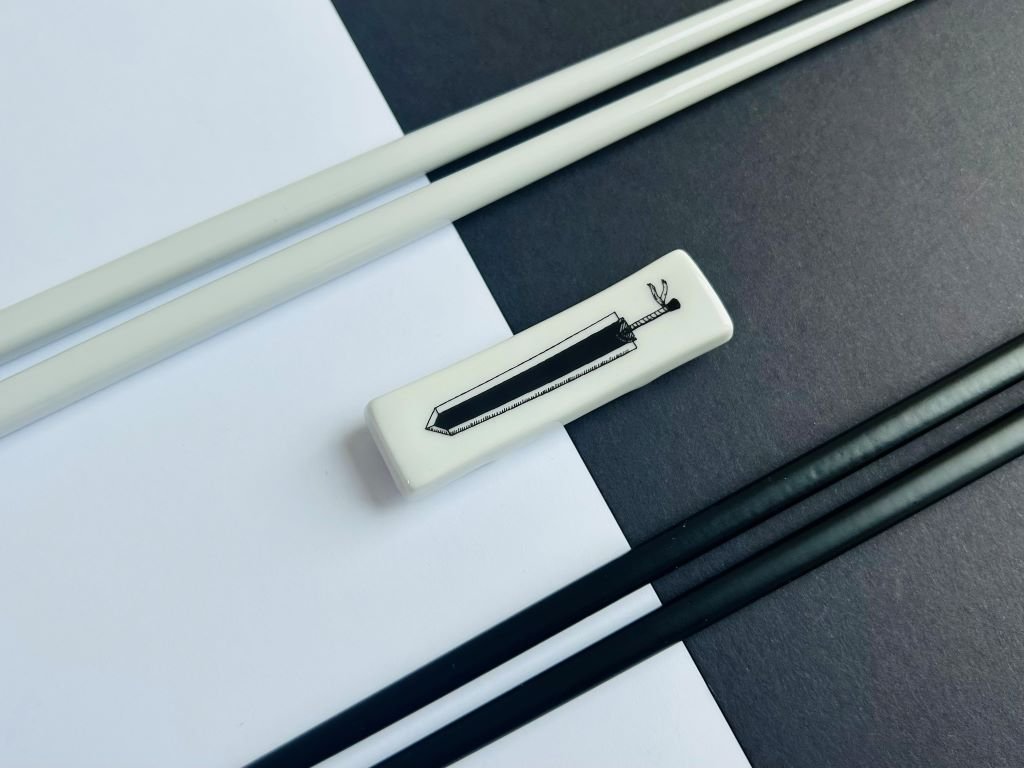 - Porcelánový odkladač na hůlky ozdobený reprodukcí mých perokreseb mečů ze známých anime seriálů