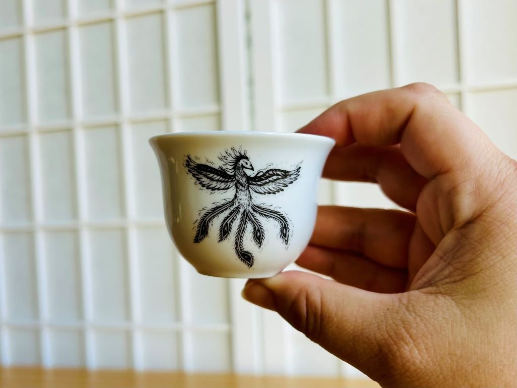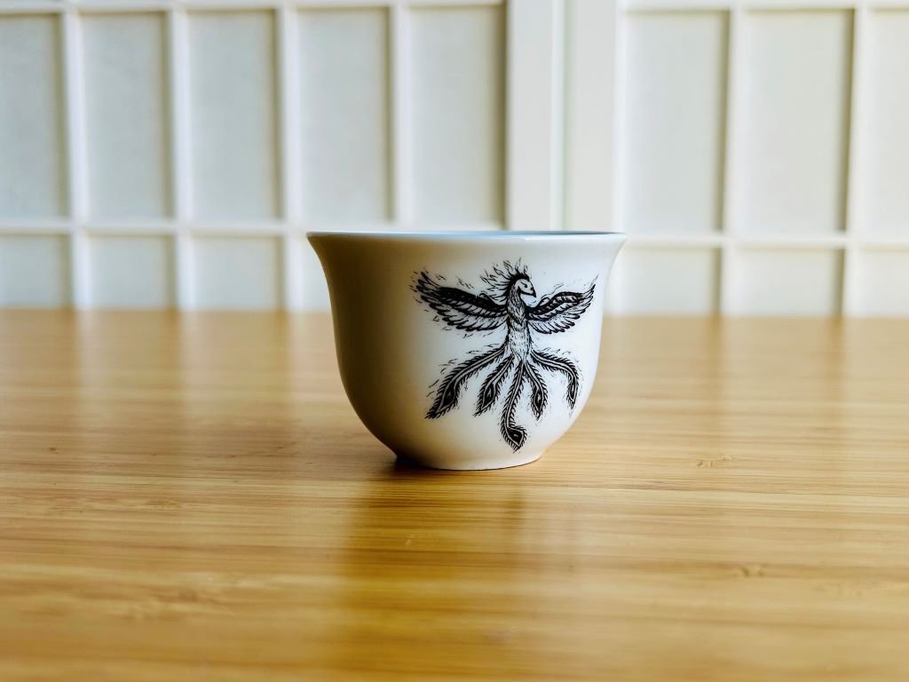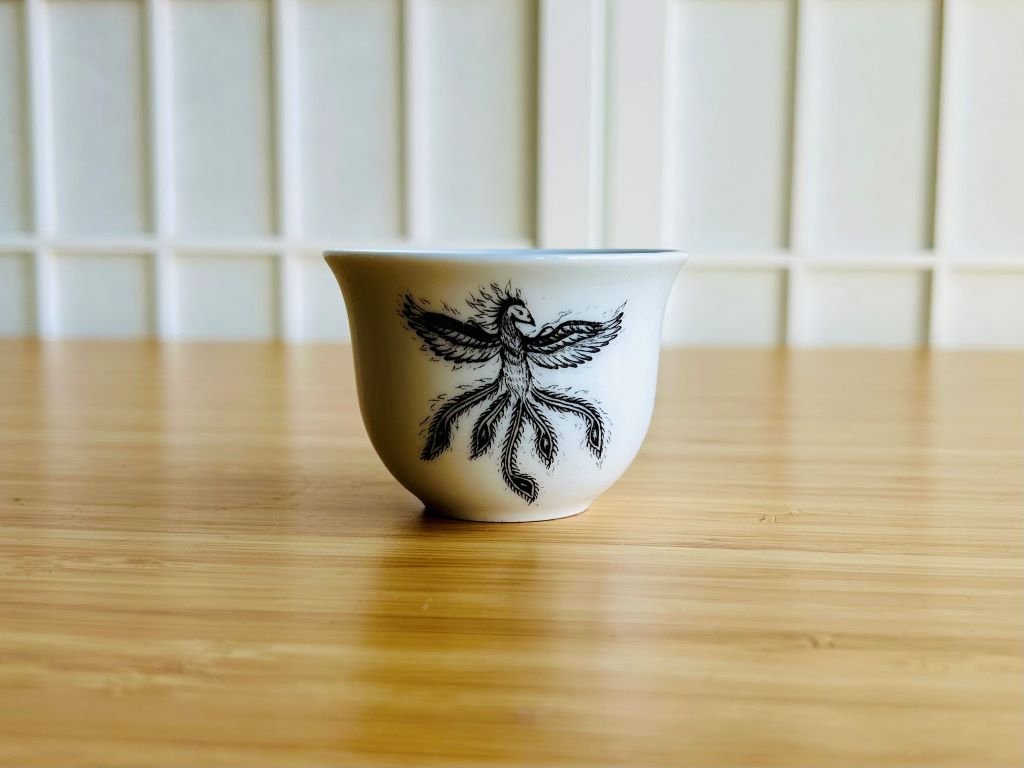 - Porcelánový pohárek na saké a čaj ozdobený reprodukcí mé perokresby inspirovanou letícím fénixem