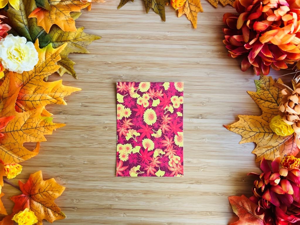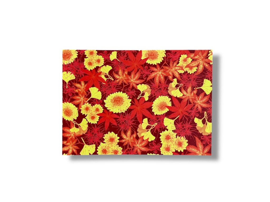 - Pohlednice ozdobená reprodukcí mých akrylových maleb a perokreseb chryzantém, javorových listů, listů stromu ginkgo a pavoučí lilie