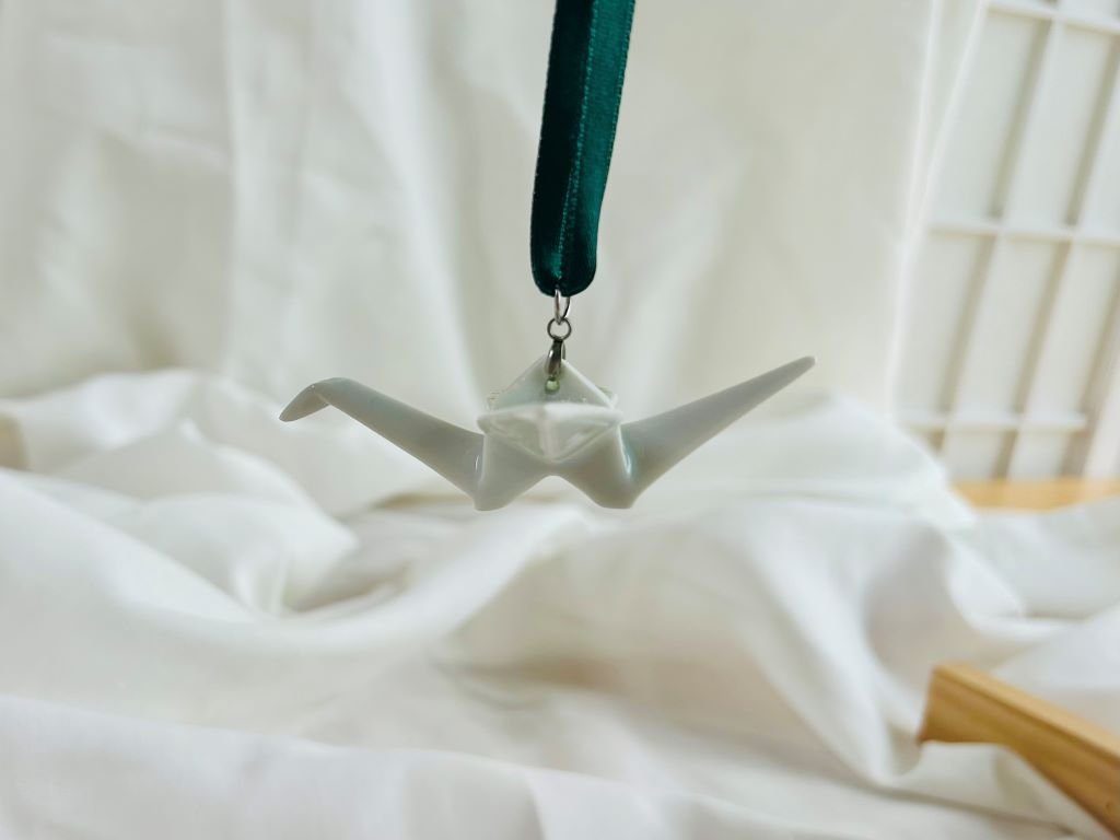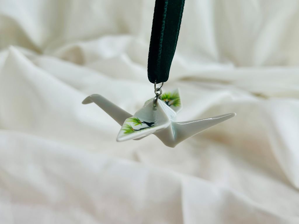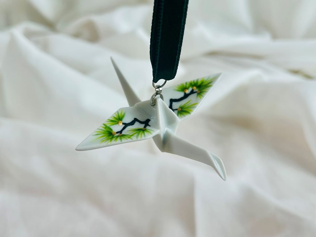 Porcelánový origami jeřáb k zavěšení s motivem dlouhověké borovice