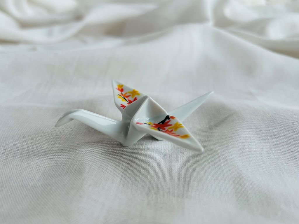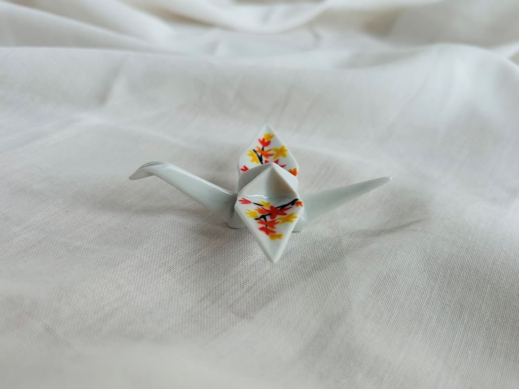 Porcelánová ozdoba origami jeřába s ručně namalovaným japonským javorem v krásných podzimních barvách