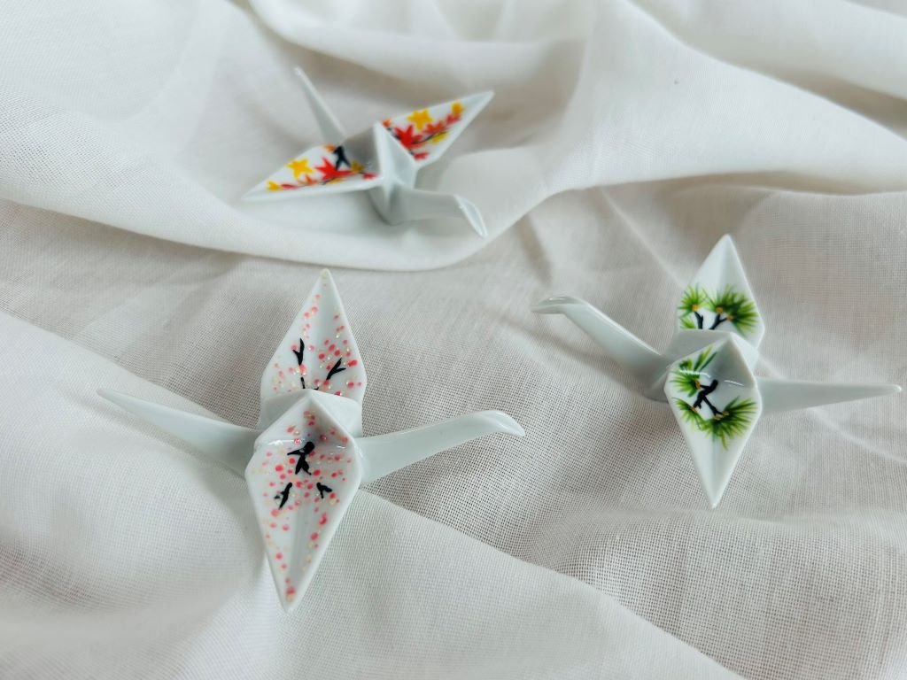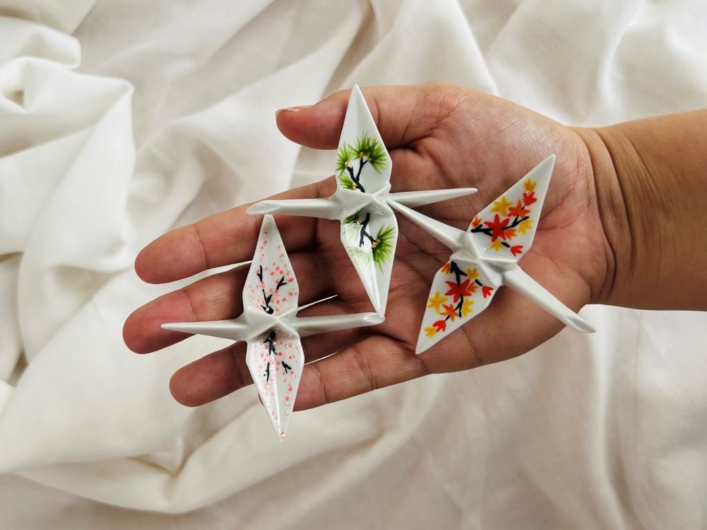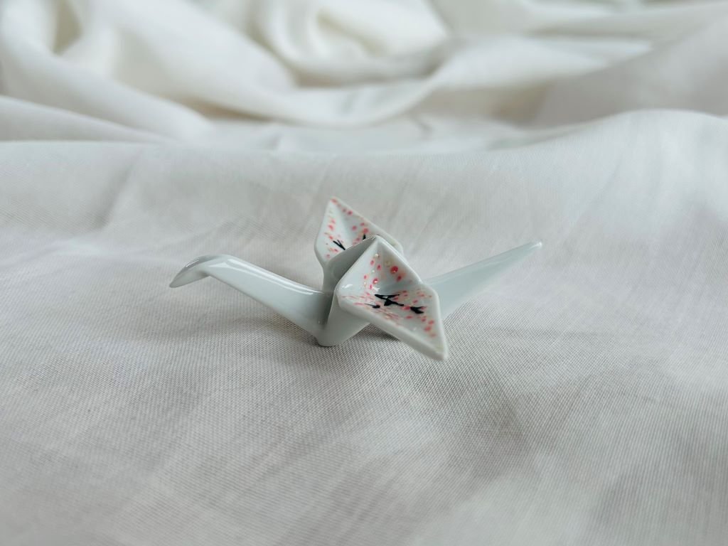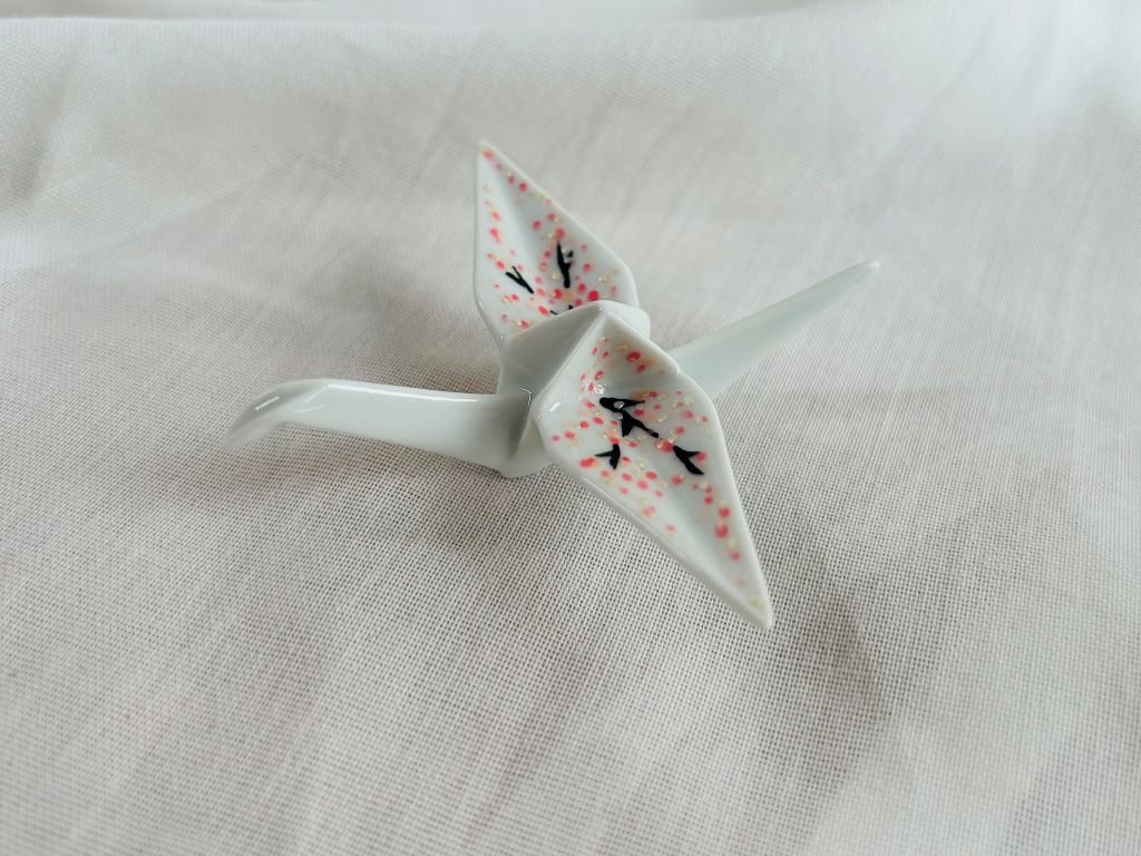 Porcelánová ozdoba origami jeřába ozdobená ruční malbou kvetoucích sakur