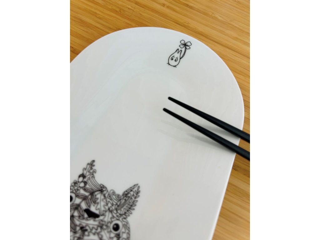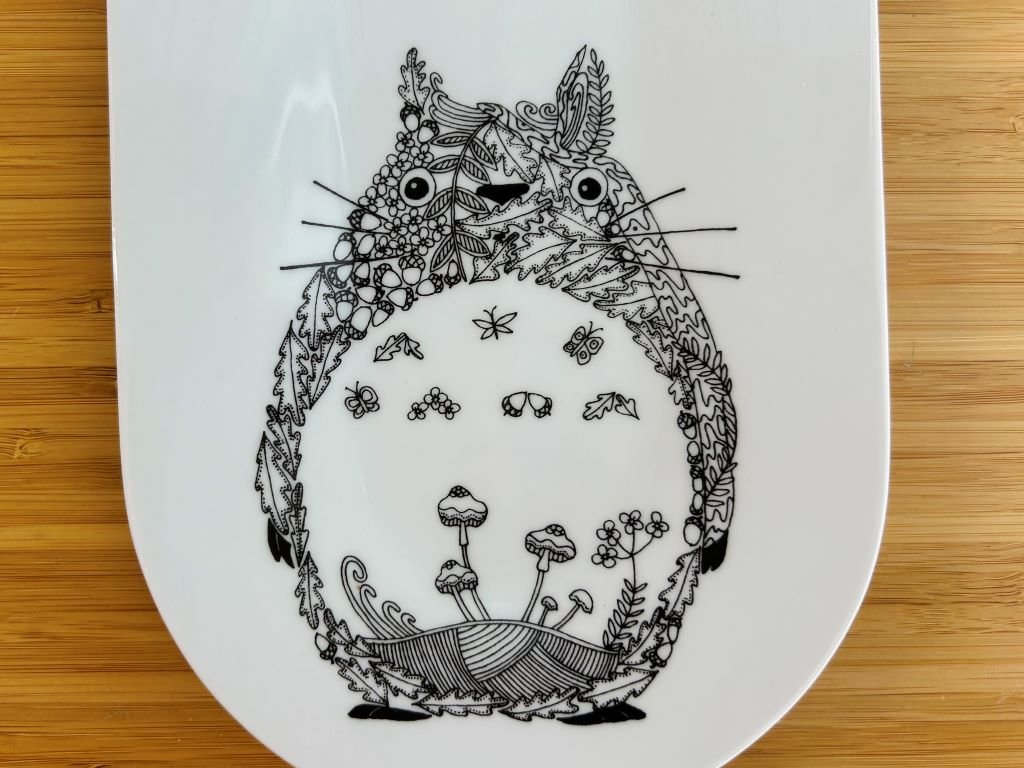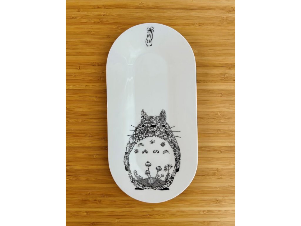 - Porcelánový tác je ozdobený reprodukcí mé perokresby lesního ducha Totora z japonského animovaného filmu