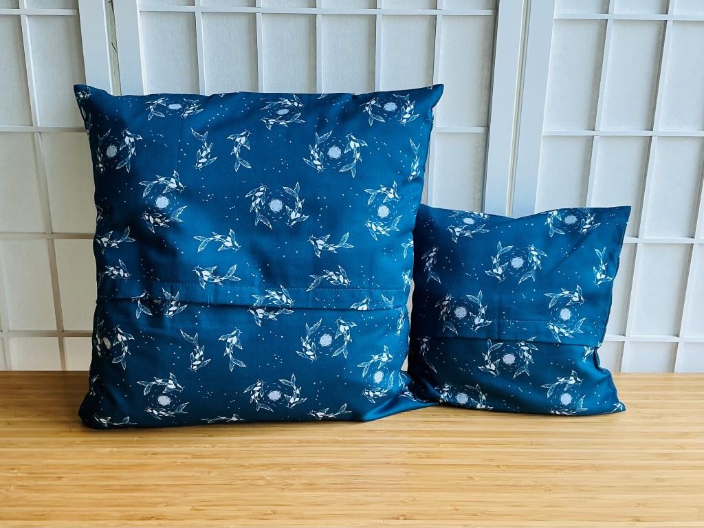 - elegantní povlak na polštář ozdobený reprodukcí mých perokreseb a akrylových maleb koi kapříků a svítícího odrazu měsíce na vodní hladině