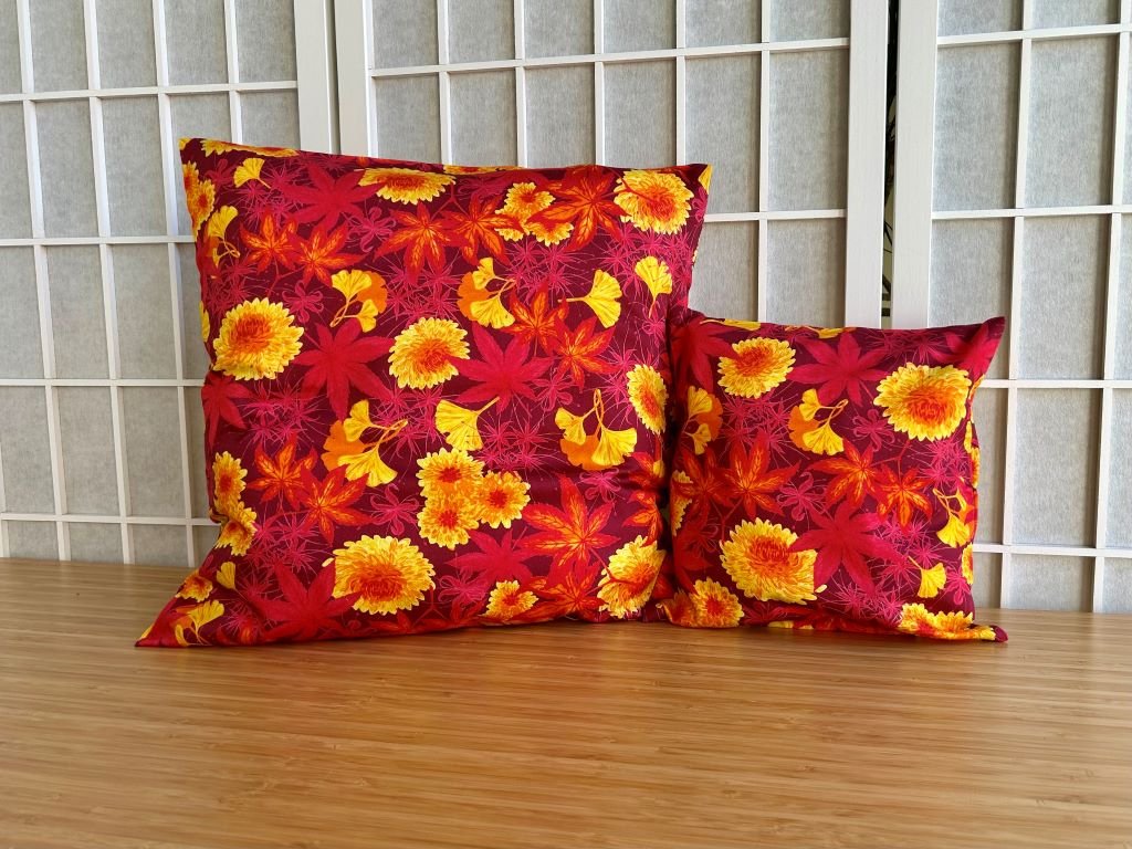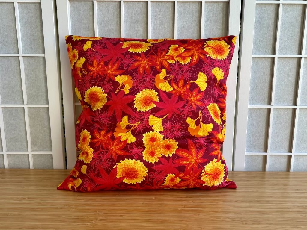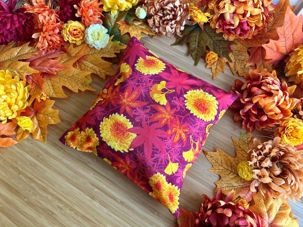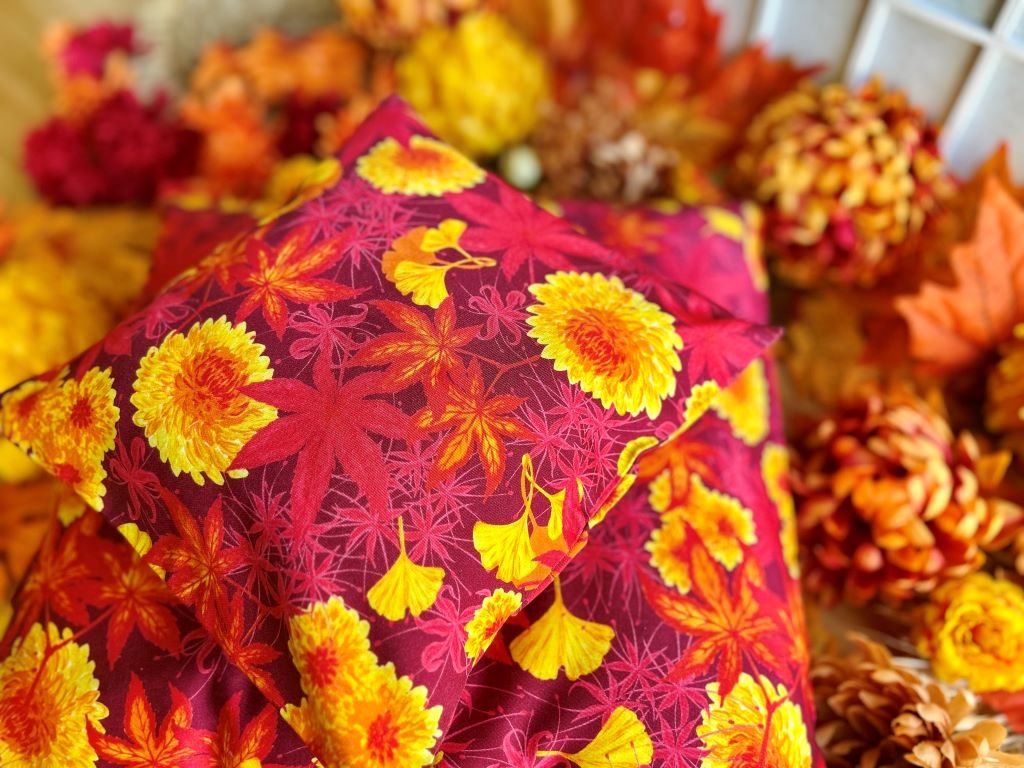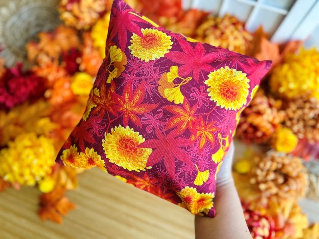 Textilní povlak na polštář plný kvetoucích chryzantém, javorových listů, listů stromu ginkgo a pavoučí lilií