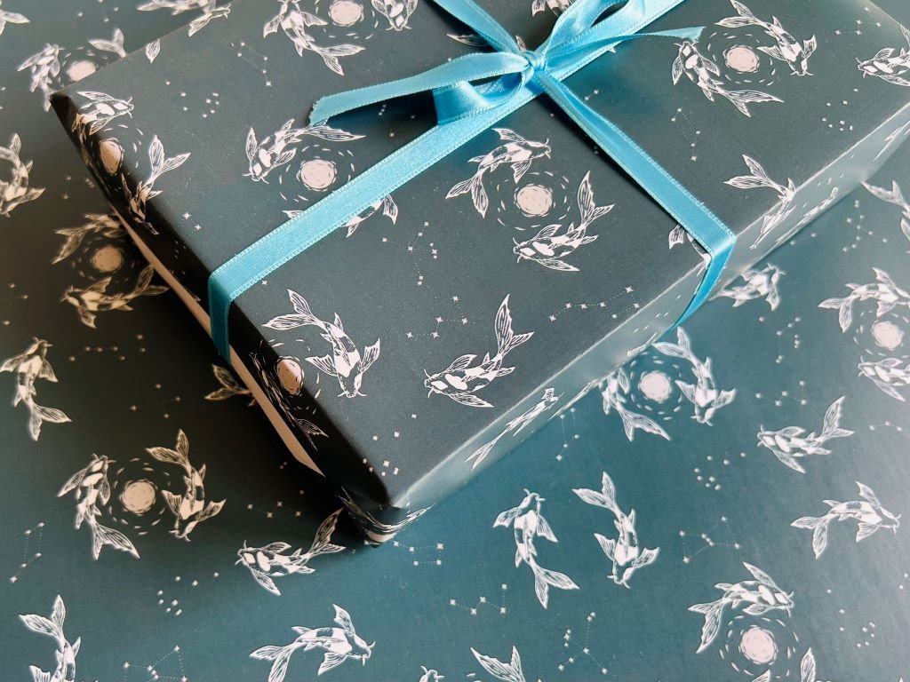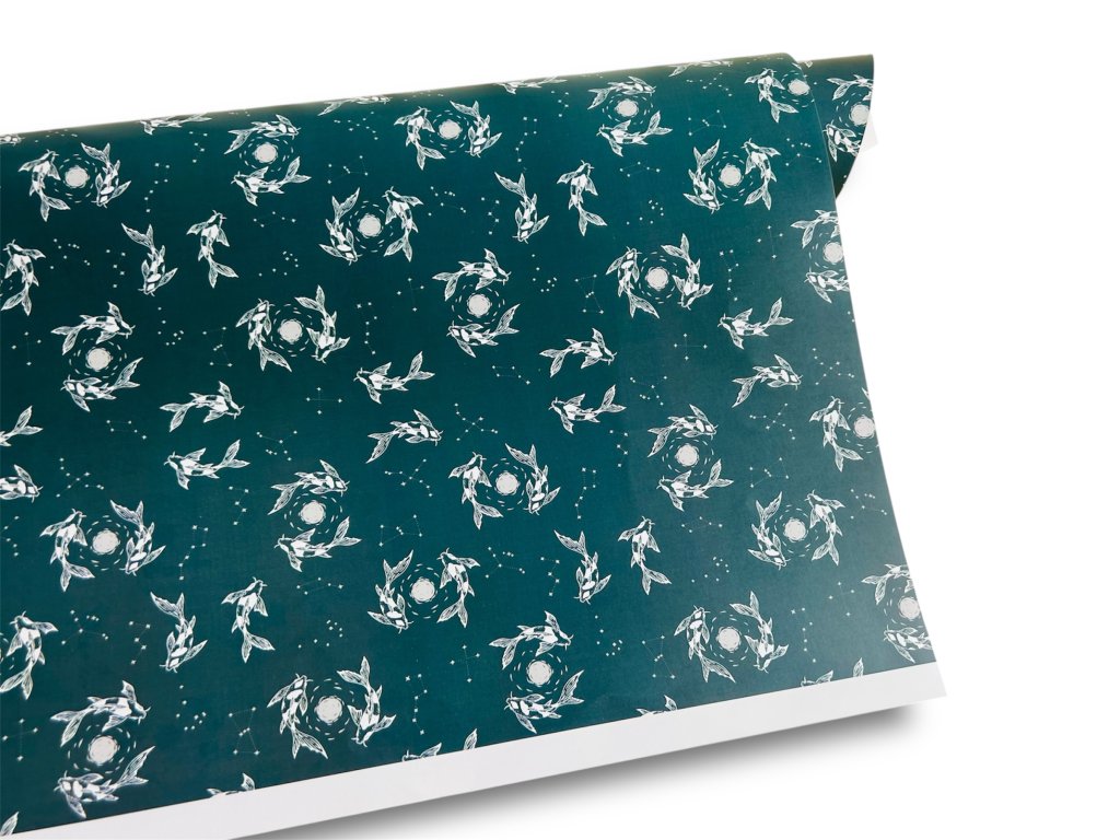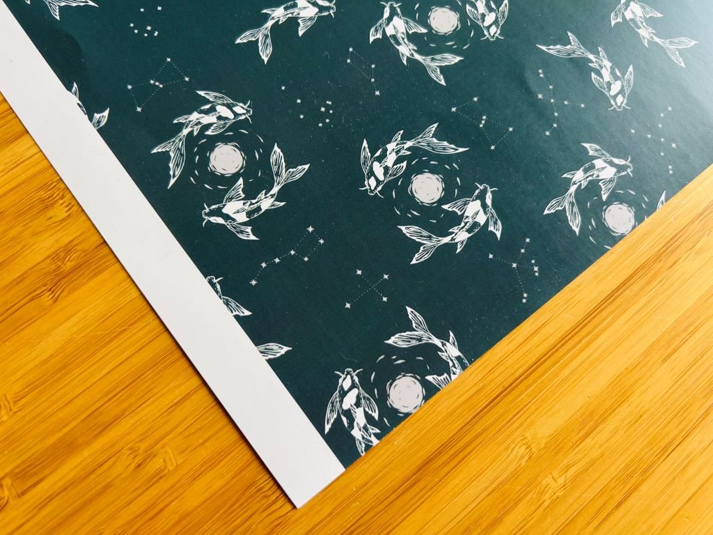 - modrý balící papír s koi kapříky s odrazem měsíce na vodní hladině