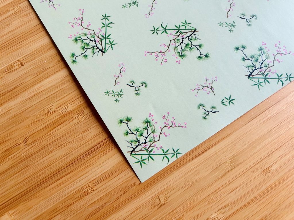 - zelený papír s tradičním východoasijským motivem Tři přátelé zimy