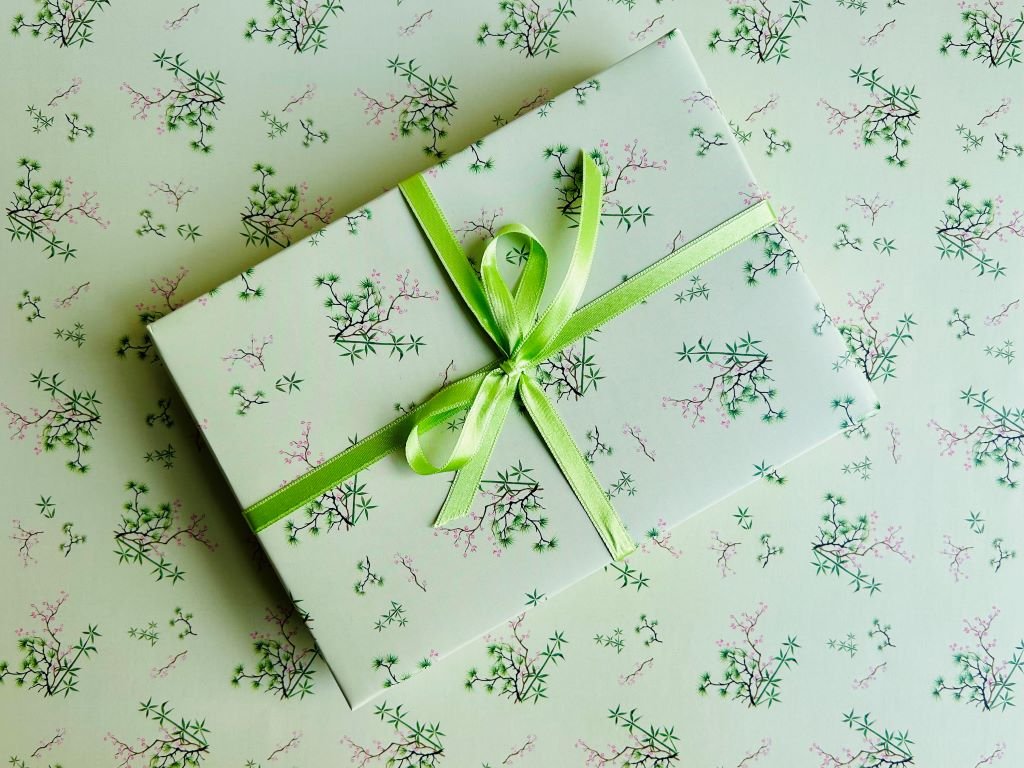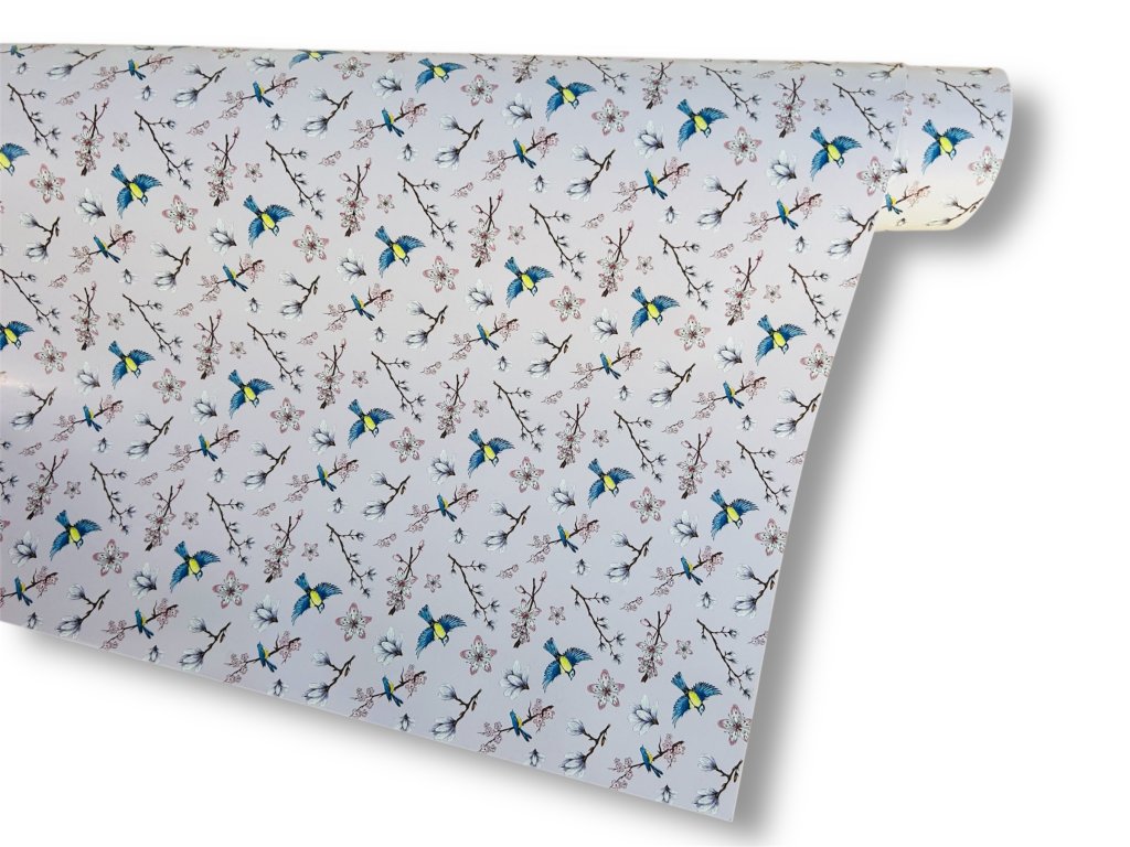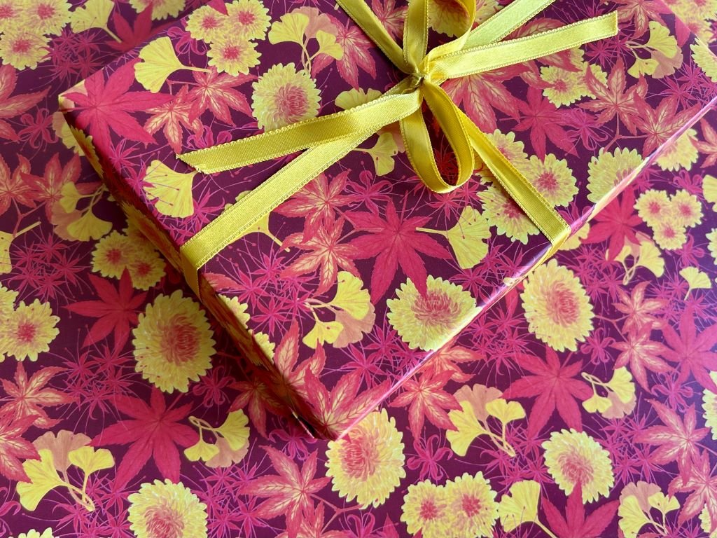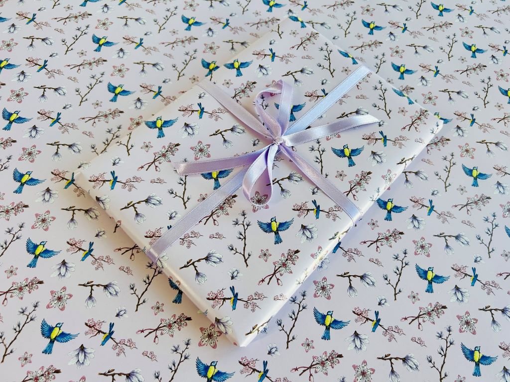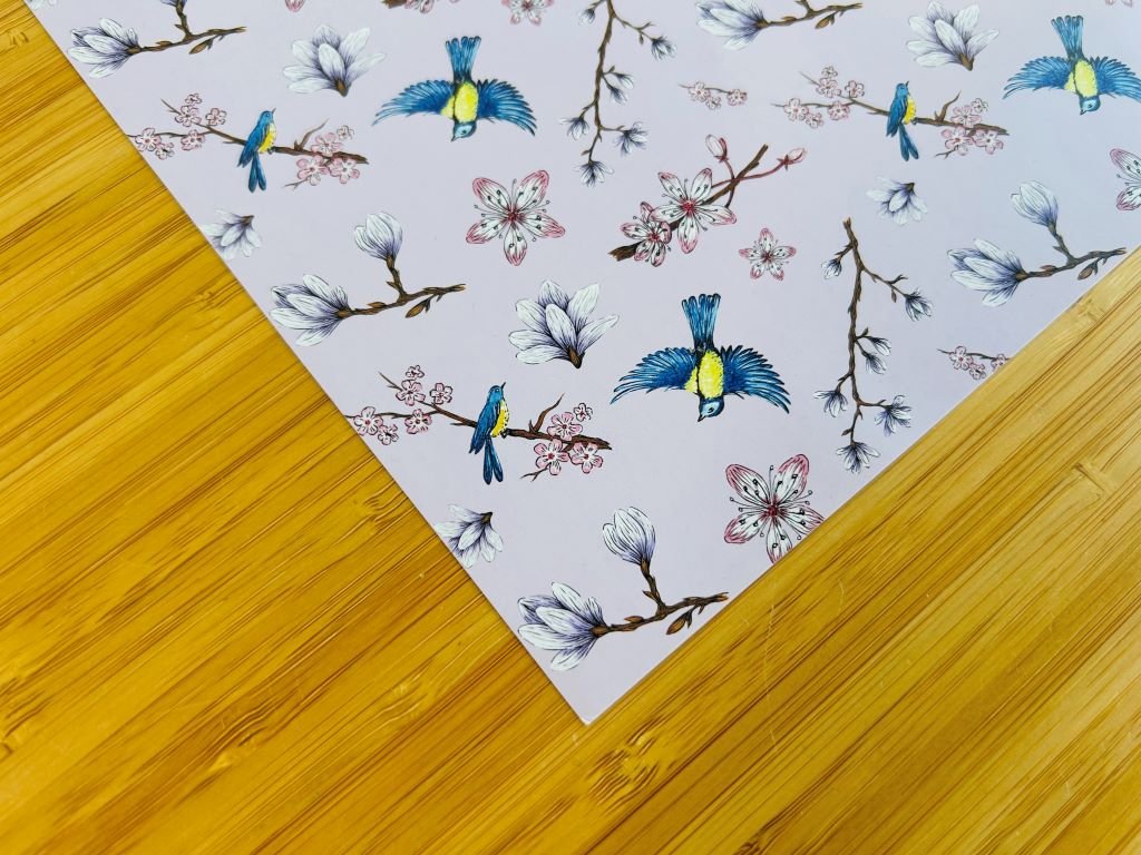 - fialový balící papír se sakurou, magnolií a ptáčkem