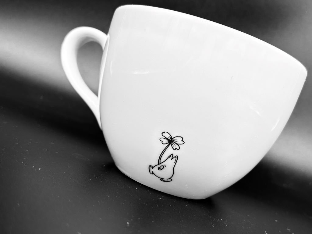 - porcelánový hrnek a lžička z nerezu ozdobené reprodukcí mých perokreseb lesního ducha Totora z japonského animovaného filmu
