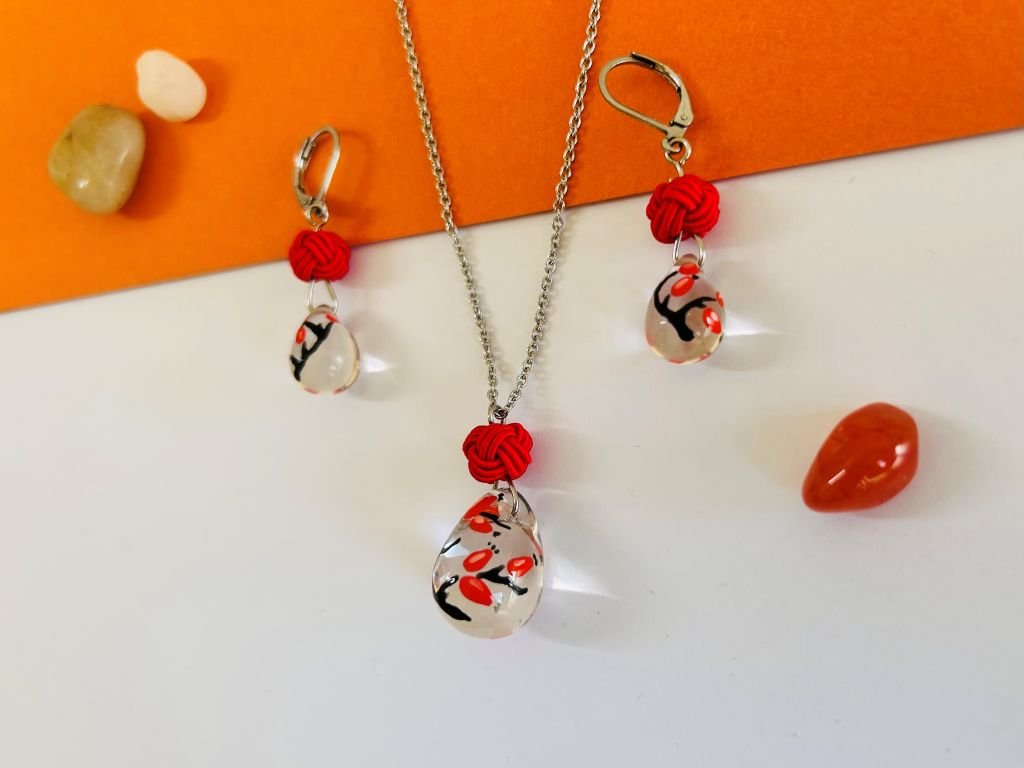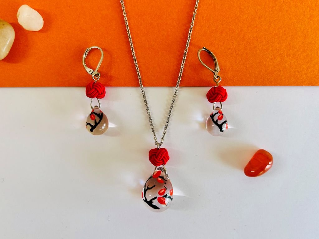 Skleněná sada šperků s mizuhiki s ručně namalovaným šípkovým keřem