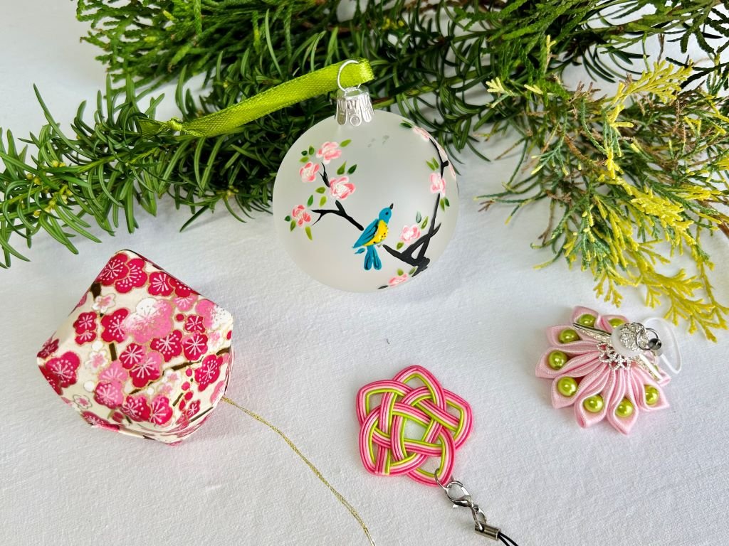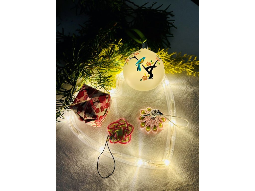 Sada vánočních ozdob "Ptáček na sakuře" s kouličkou