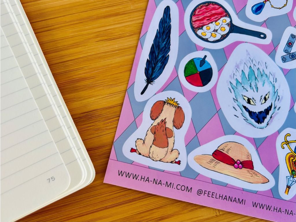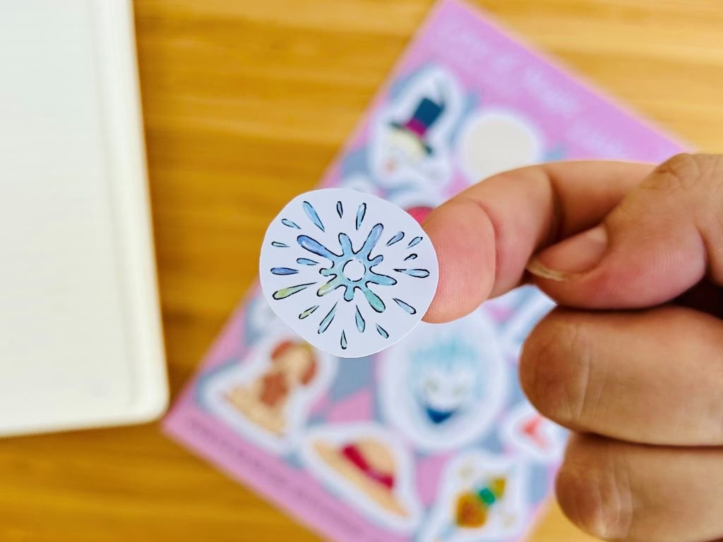 Aršík lesklých papírových samolepek má velikost menší A5 a je na něm 13 nálepek.