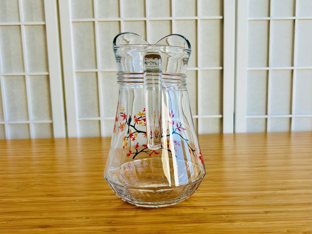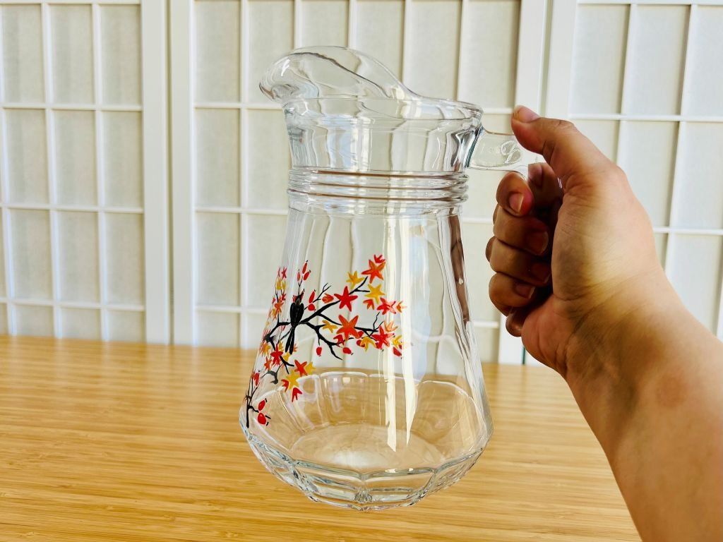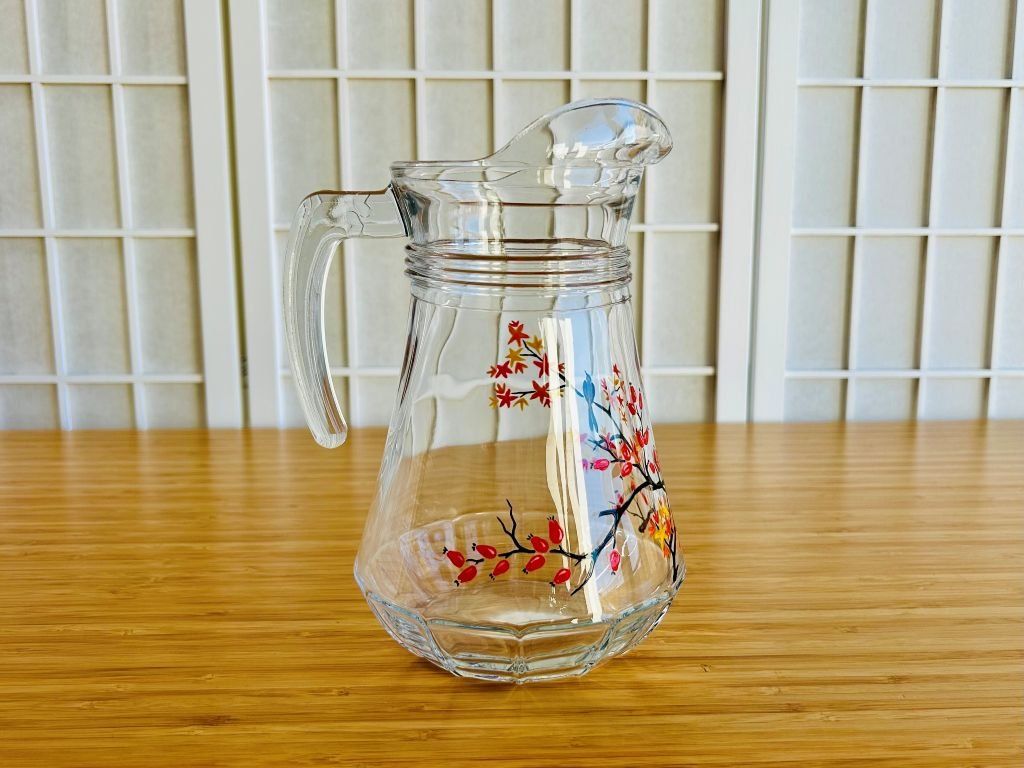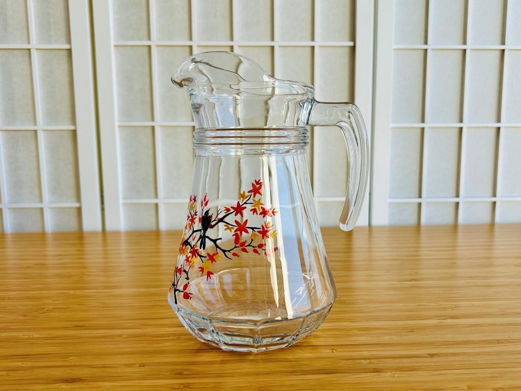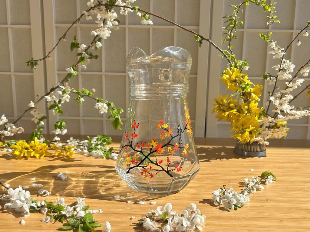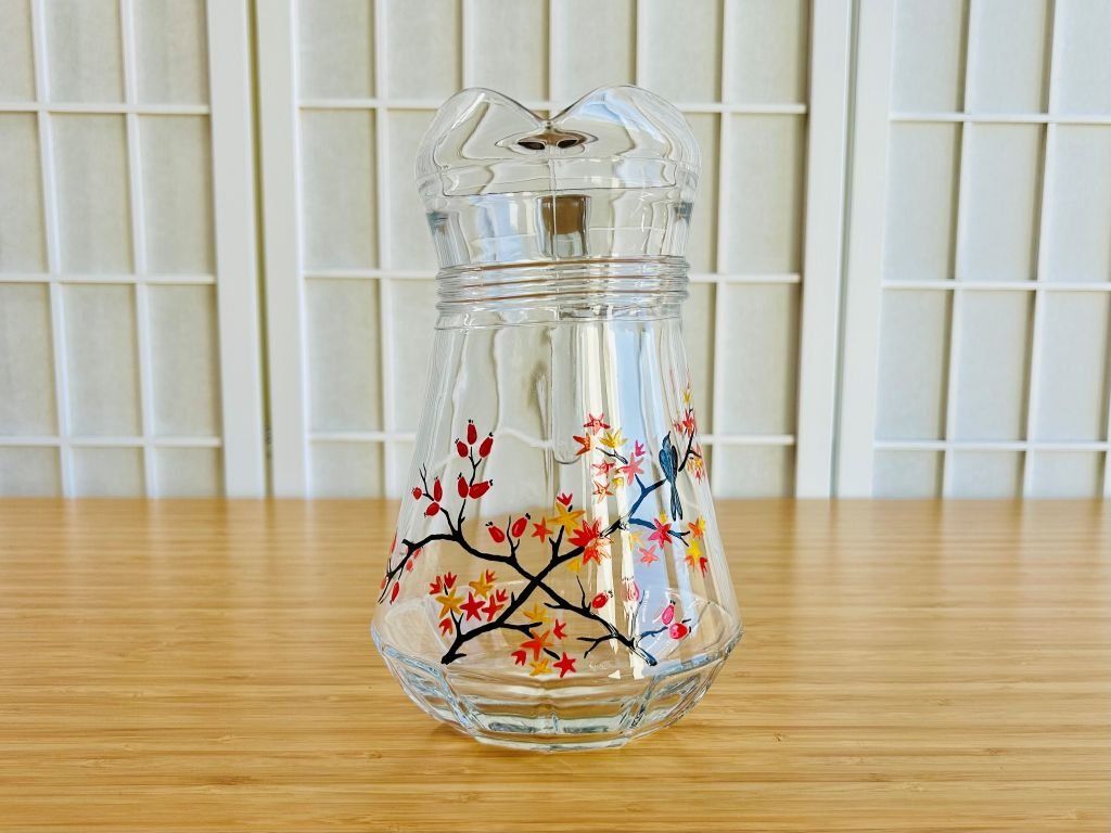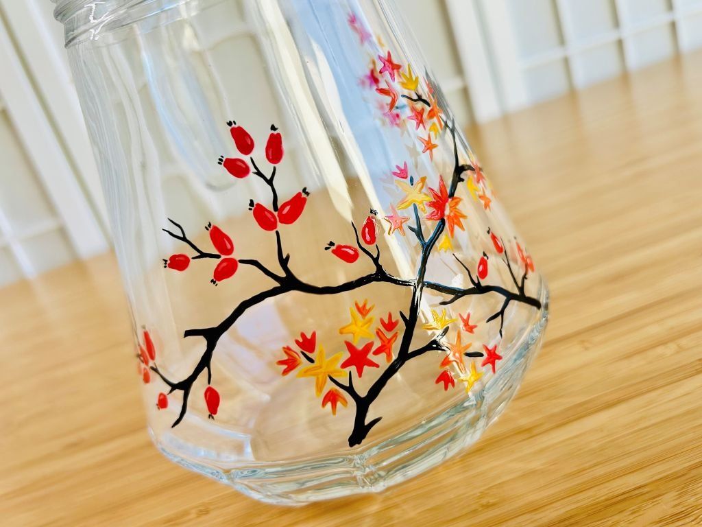 Skleněný džbán ozdobený malbou barevných podzimních javorů a šípkového keře